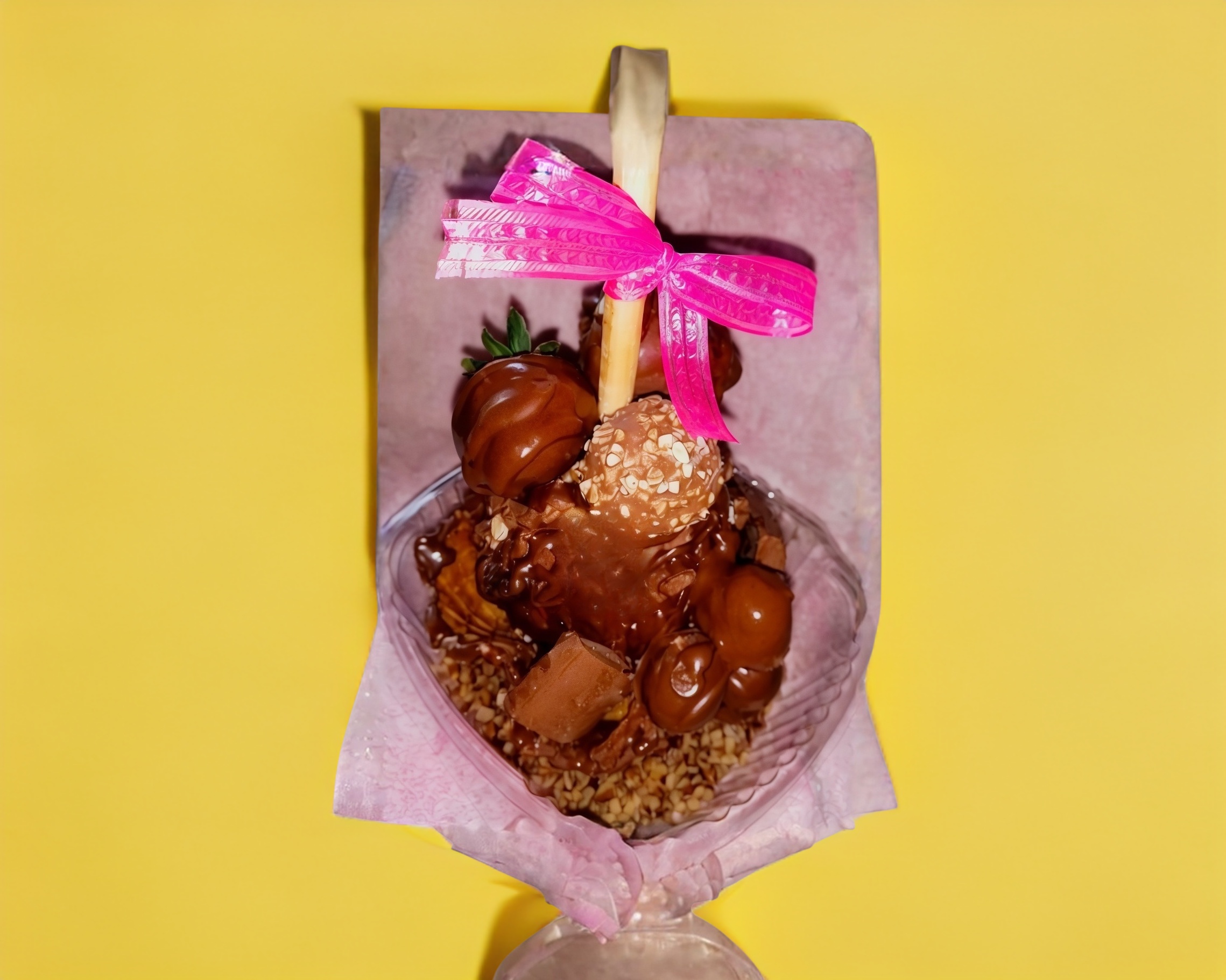 Abrigo de chocolate, 1 fresa cubierta de chocolate, nuez picada, y dos chocolates.