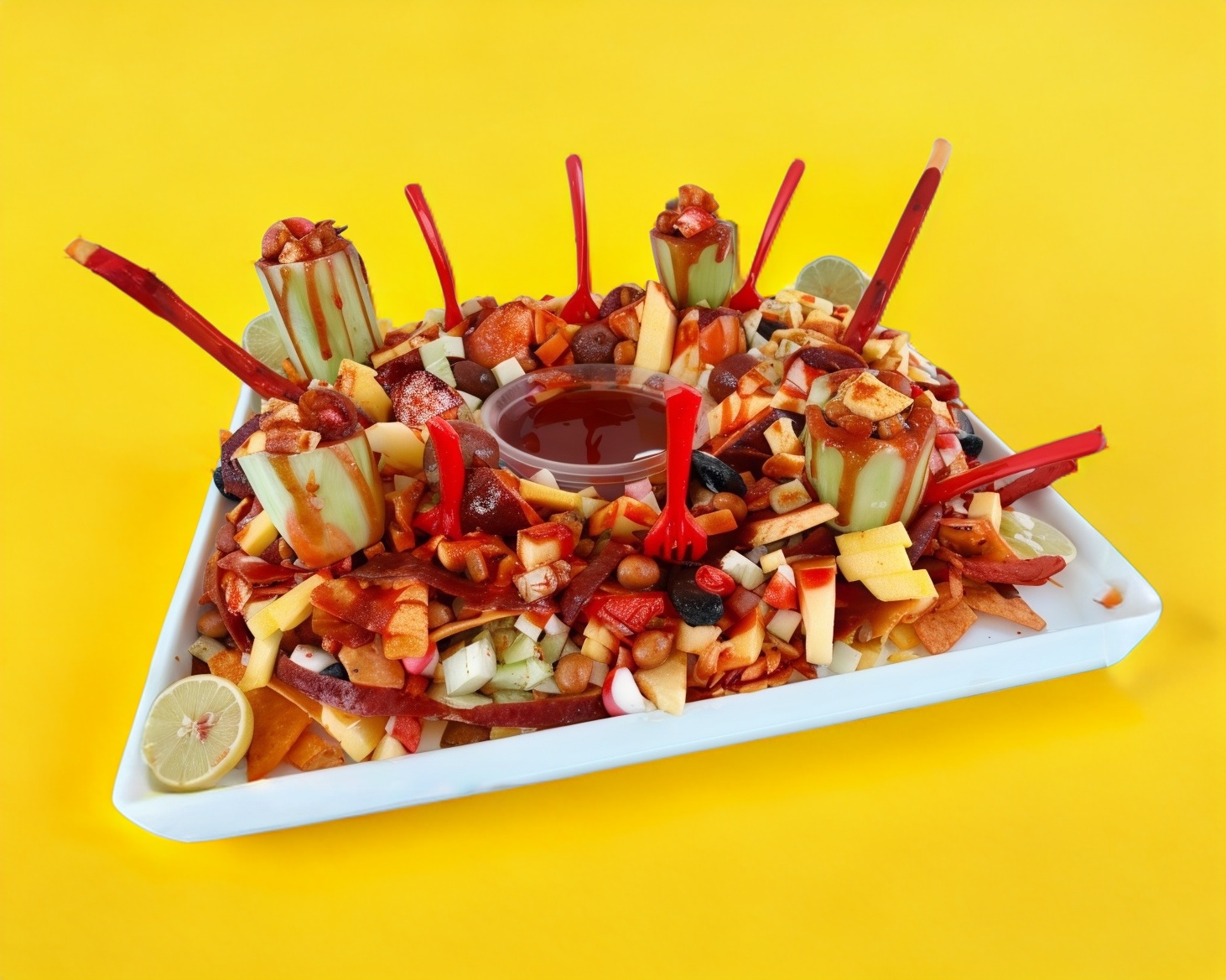 5 tacos campechanos, 6 vasos de pepilocos, base de doritos de 245gr. Cueritos de cerdo en escabeche, mix de frutas tropicales y de temporada, topping de gomitas dulces y enchiladas, botana de cacahuates a elegir, 1 manzana de cualquier especialidad y 2 basto