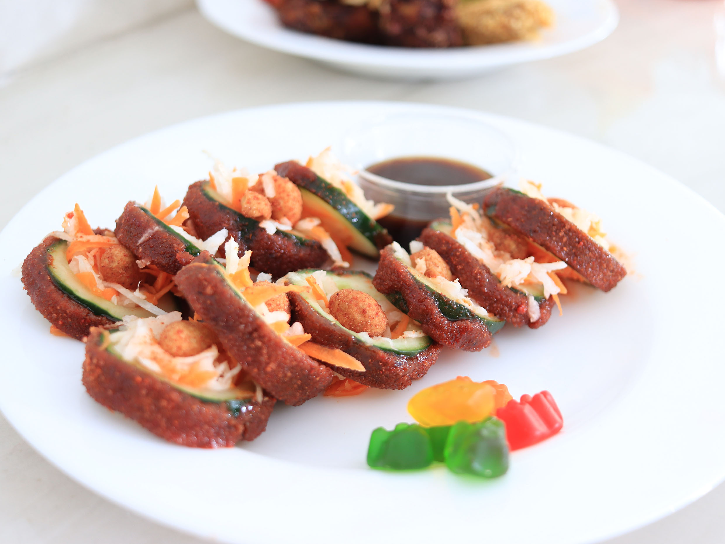 Pepinos con relleno de cacahuates a elegir, mix de frutas tropicales y de temporada, topping mixto de gomitas.