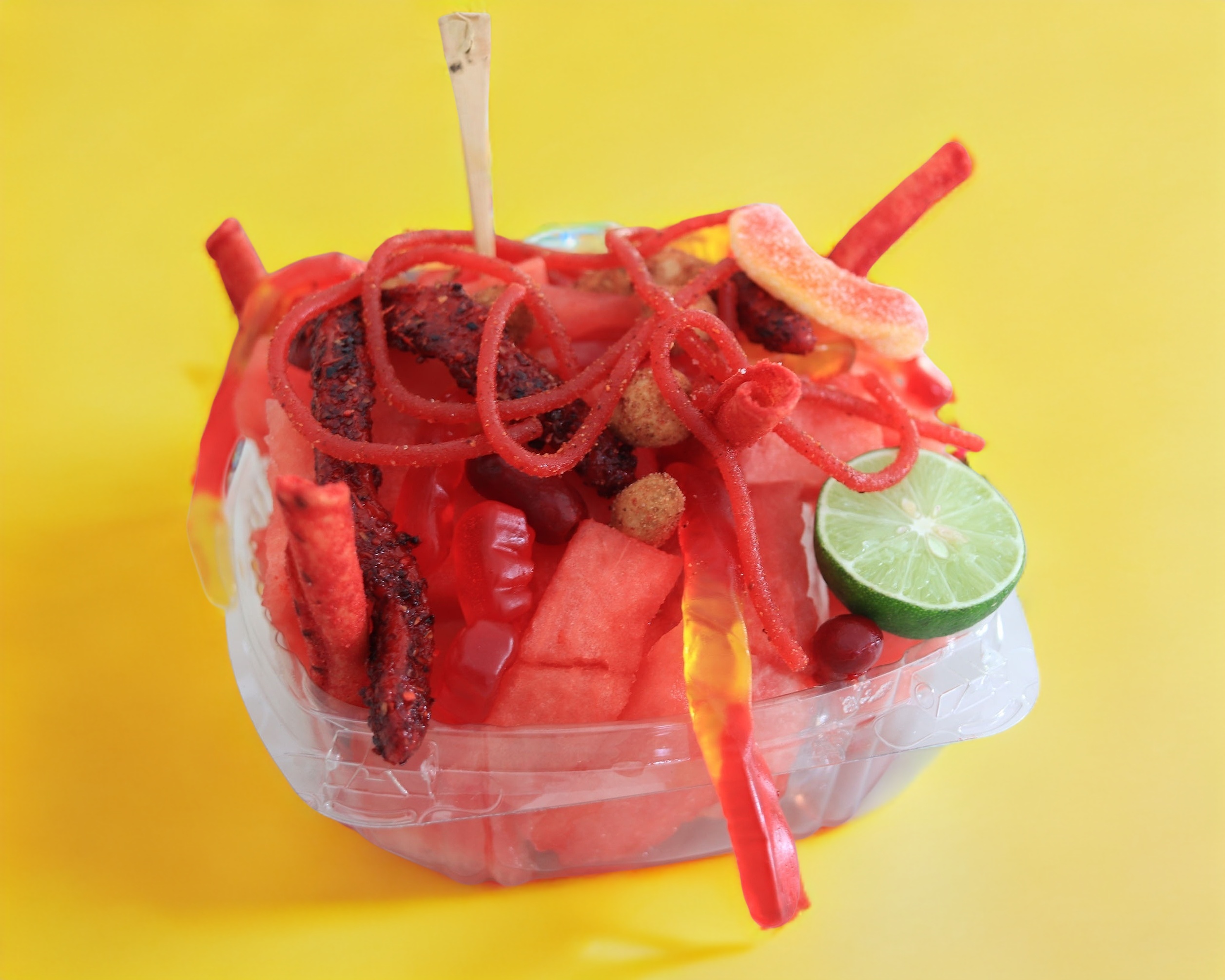 Sandia acompañada de topping de gomitas y botanas enchiladas.