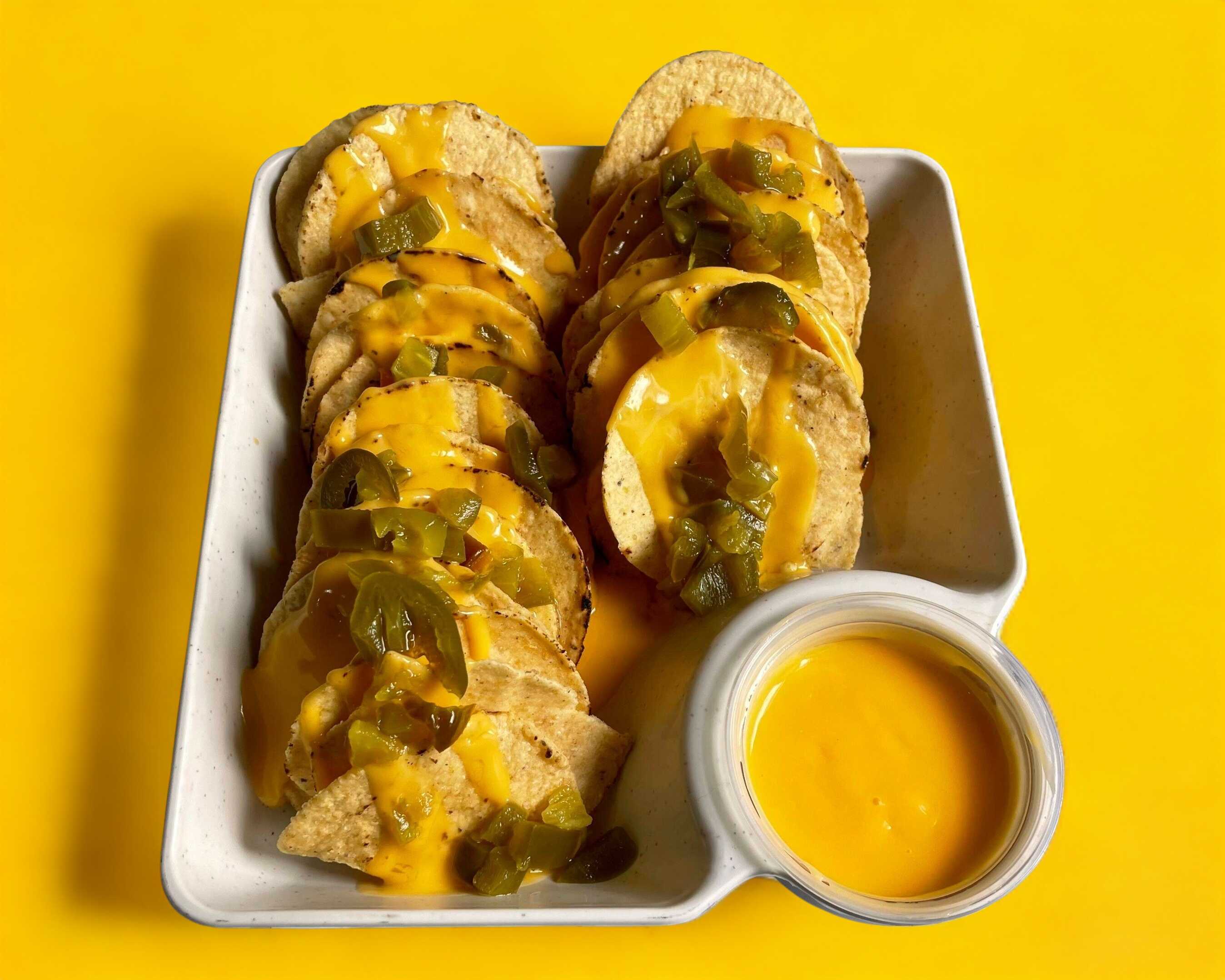 Tortillas 100 % naturales crujientes de maiz sé acompaña con Queso amarillo líquido y chiles en Vinagre