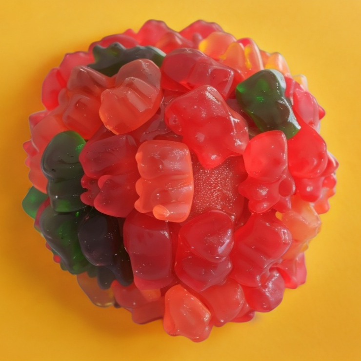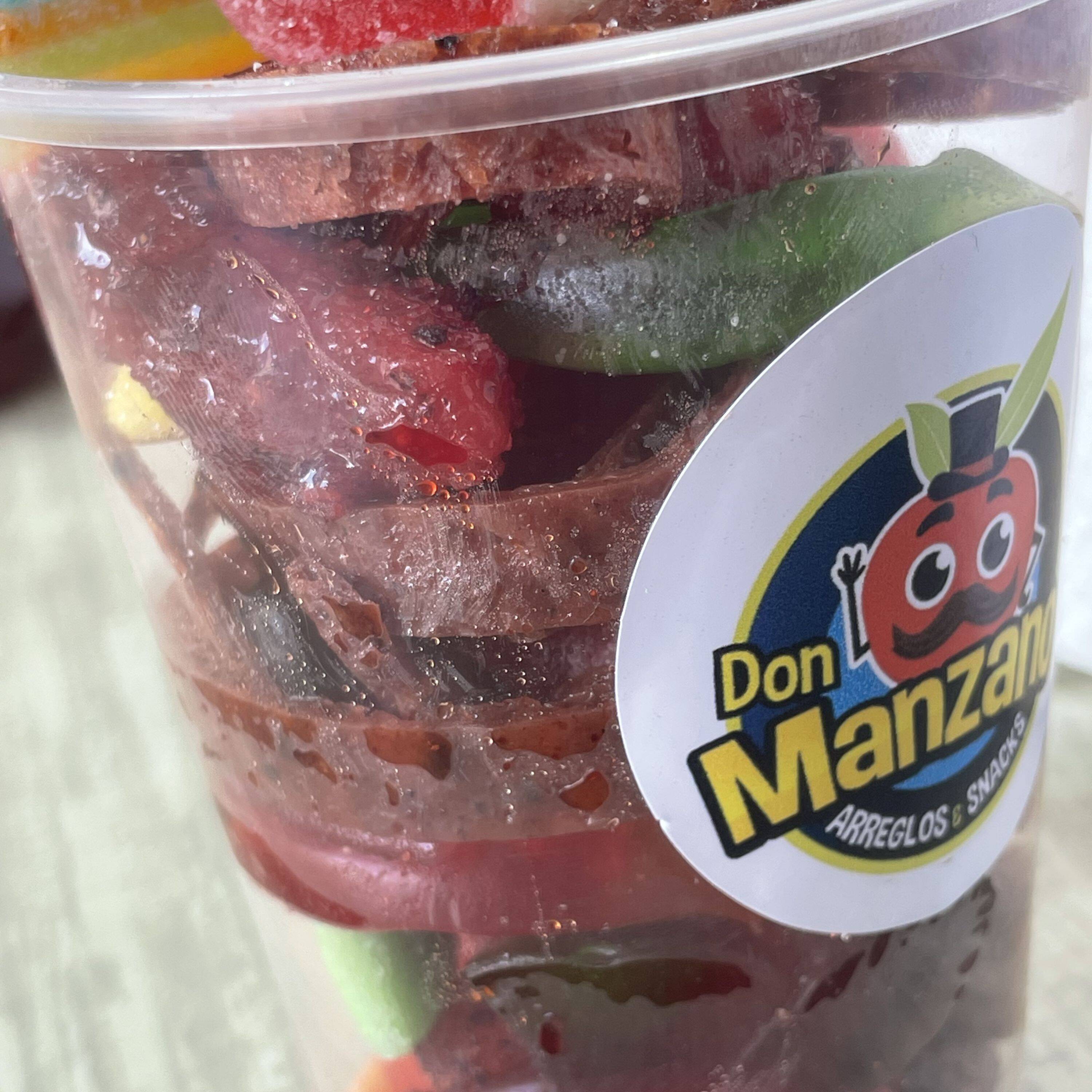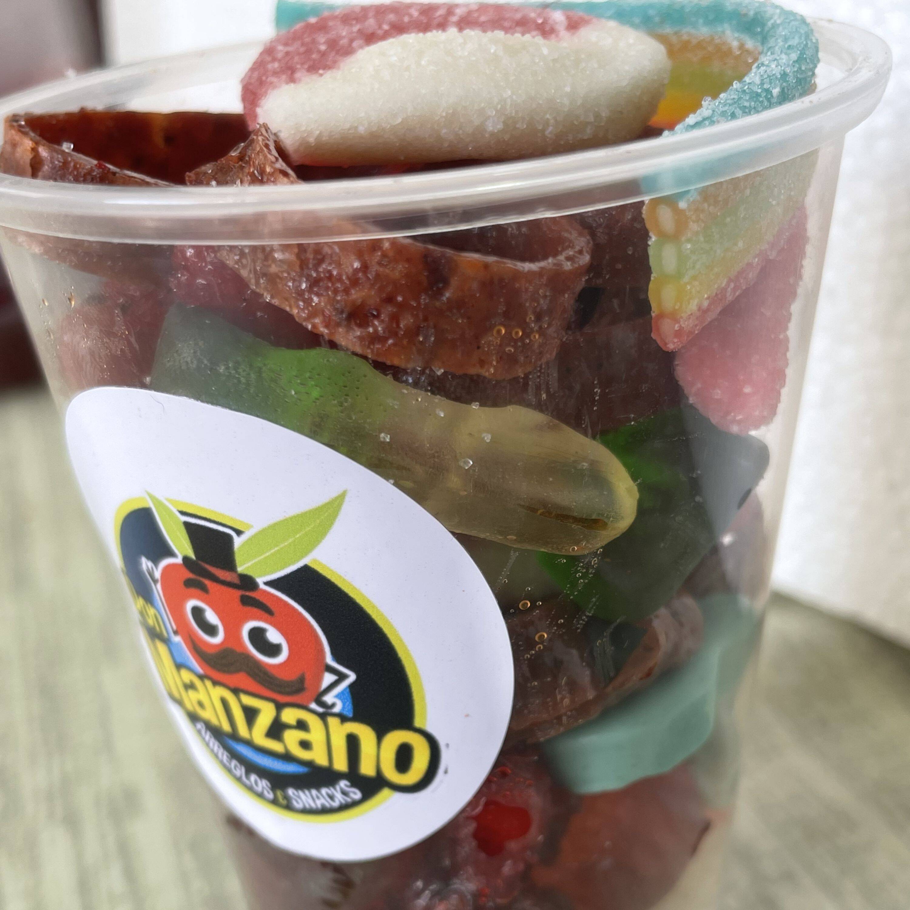 400 gramos . variedades de gomitas Dulces y enchiladas con salsa y chamoy de la casa
