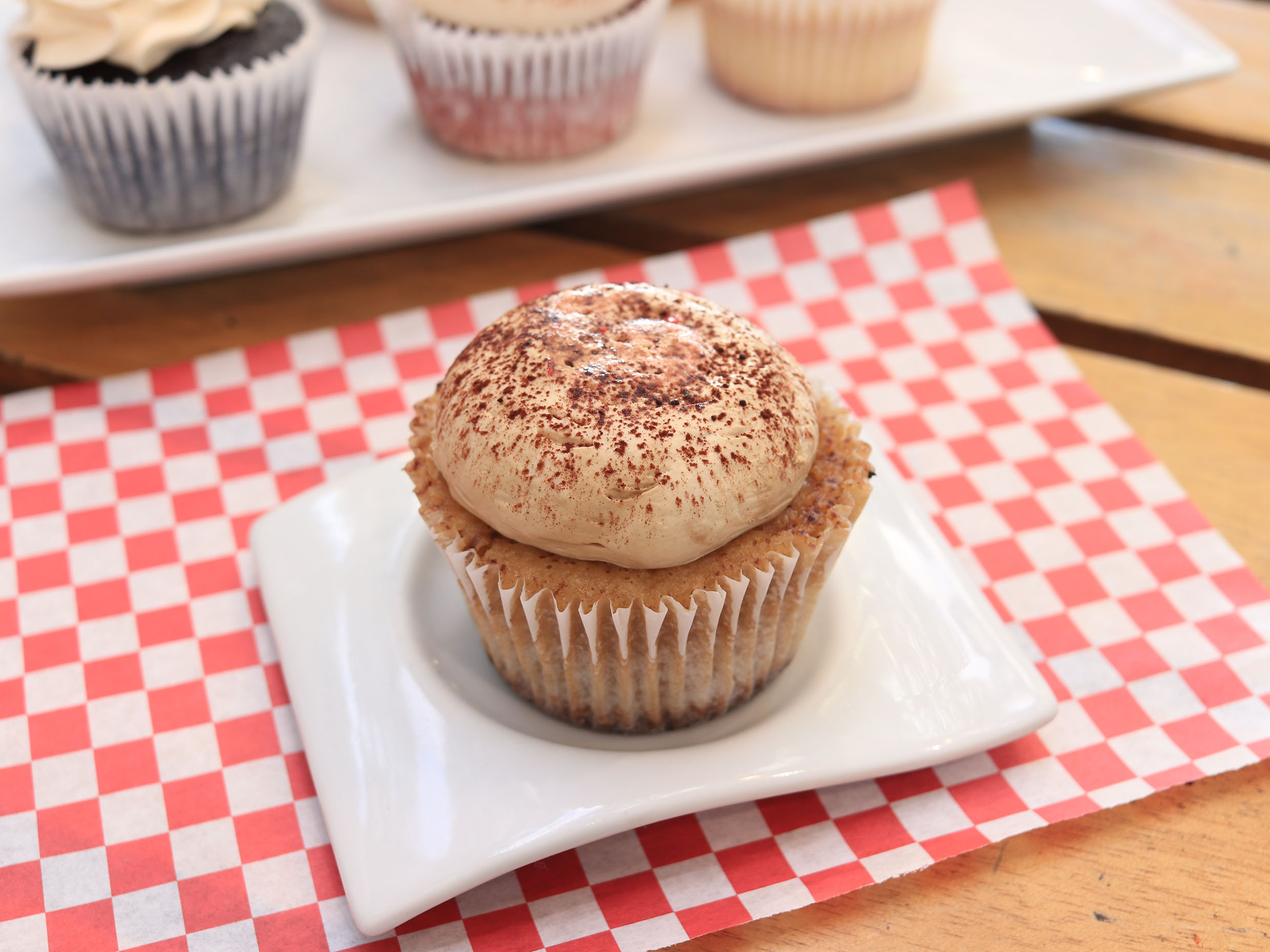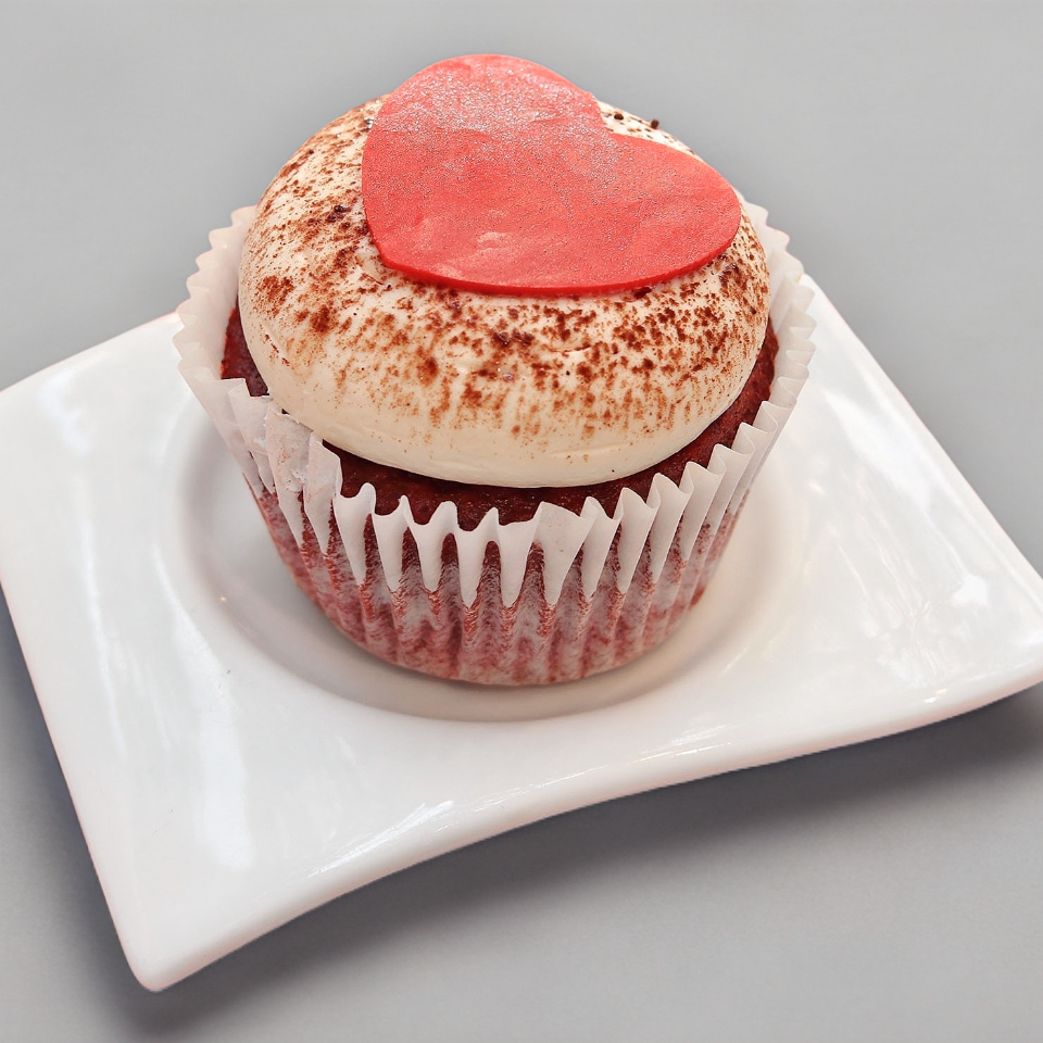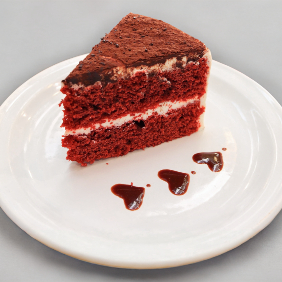 Pan a base de vainilla y cocoa, con tono rojizo simulando el terciopelo, betún de queso crema y espolvoreado de cocoa.