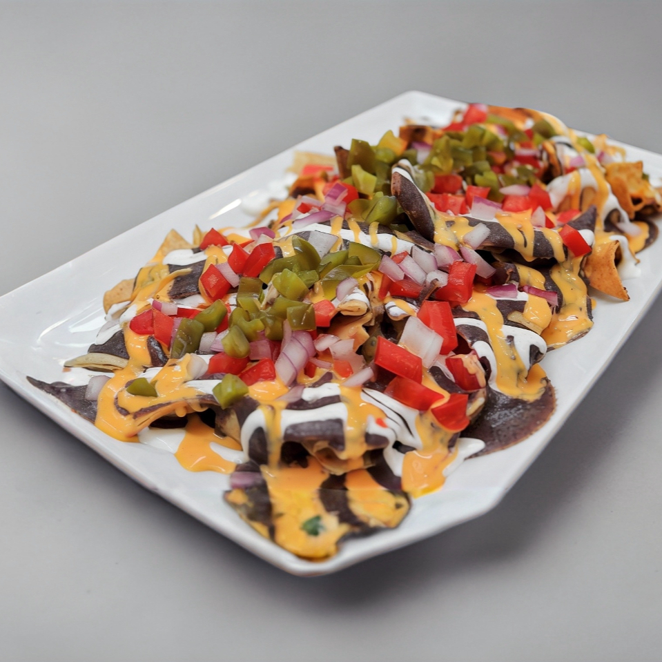 Totopo de tortilla de maíz bañados con la salsa de tu elección, con crema y queso.