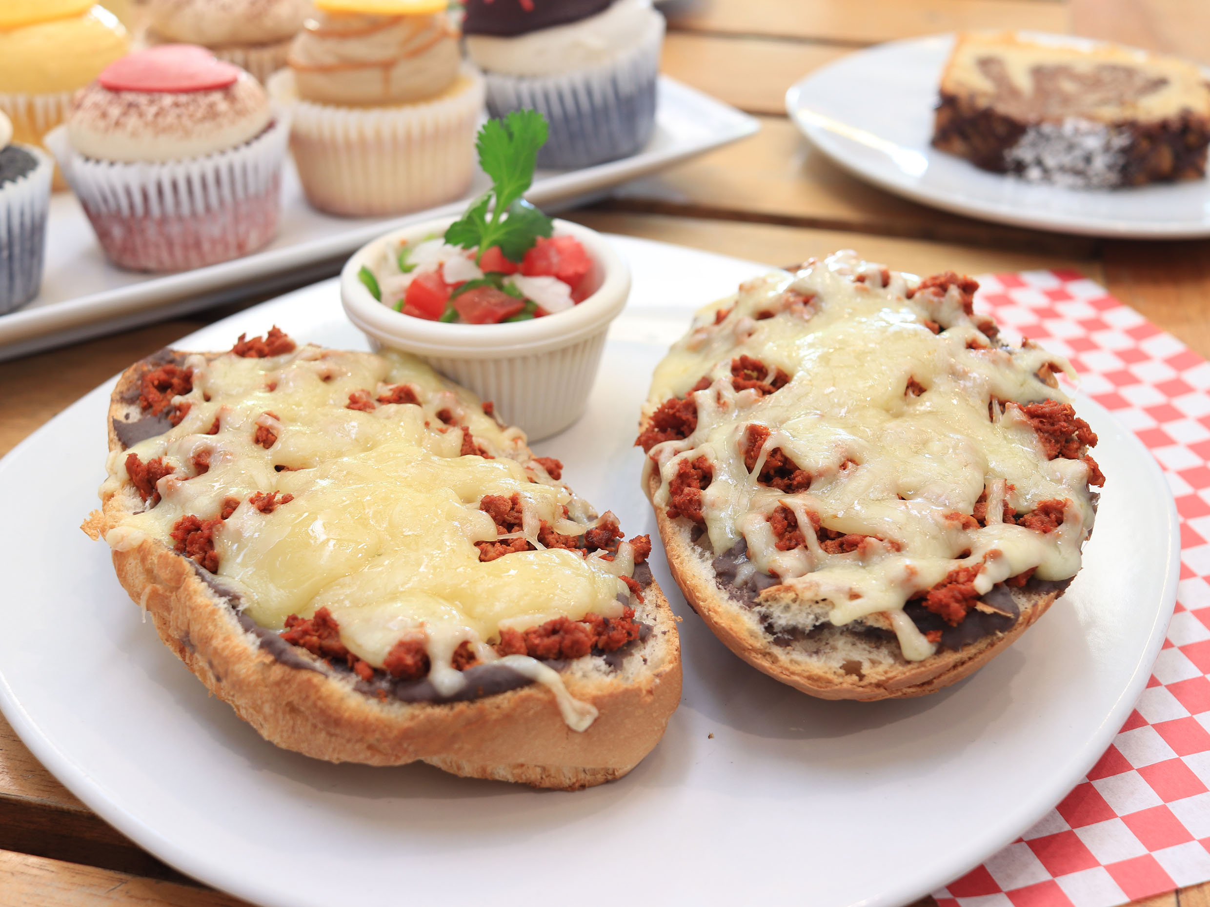2 Piezas, pan untado con frijol, queso manchego y chorizo, acompañado de pico de gallo.