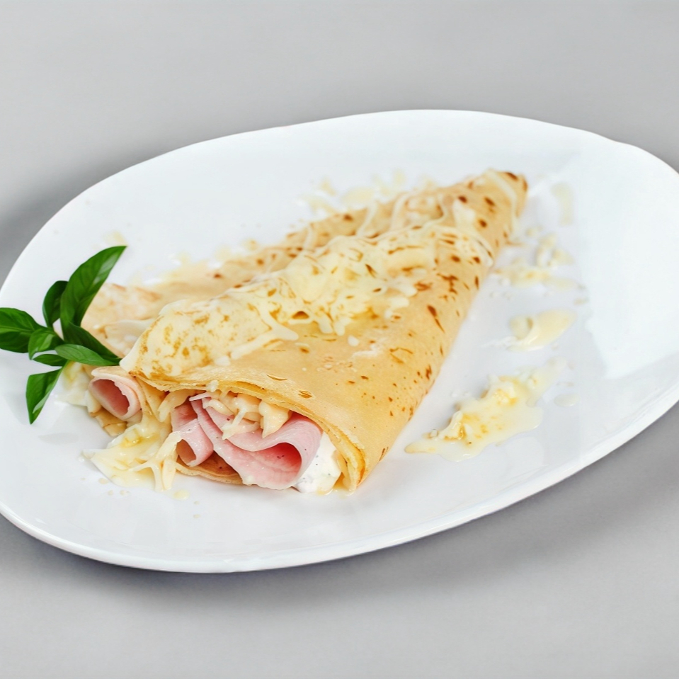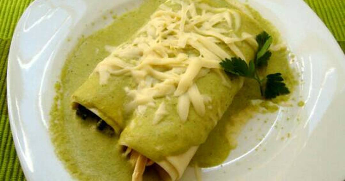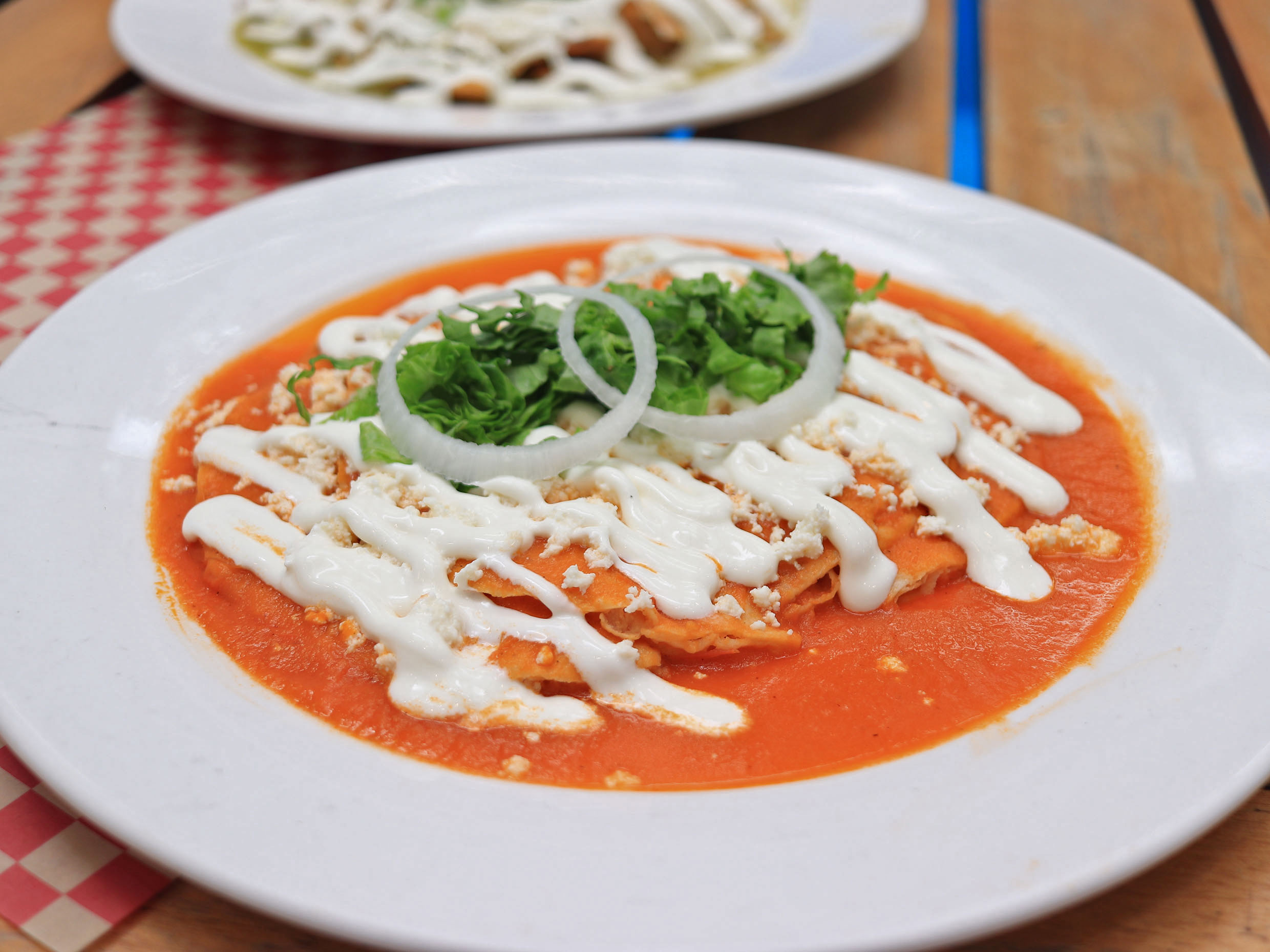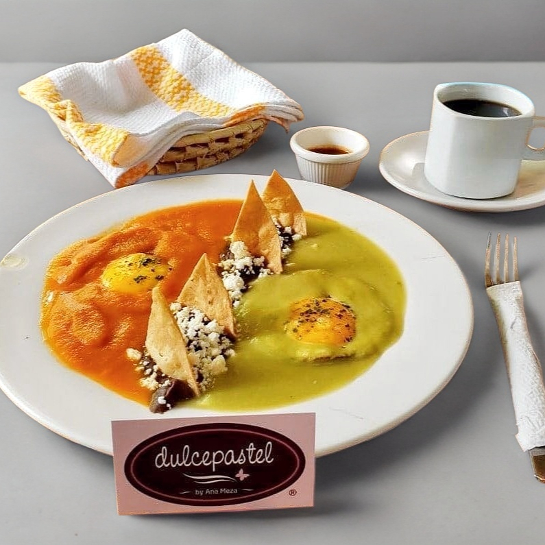Tortilla de maíz bañados con salsa de tomate, queso y crema.