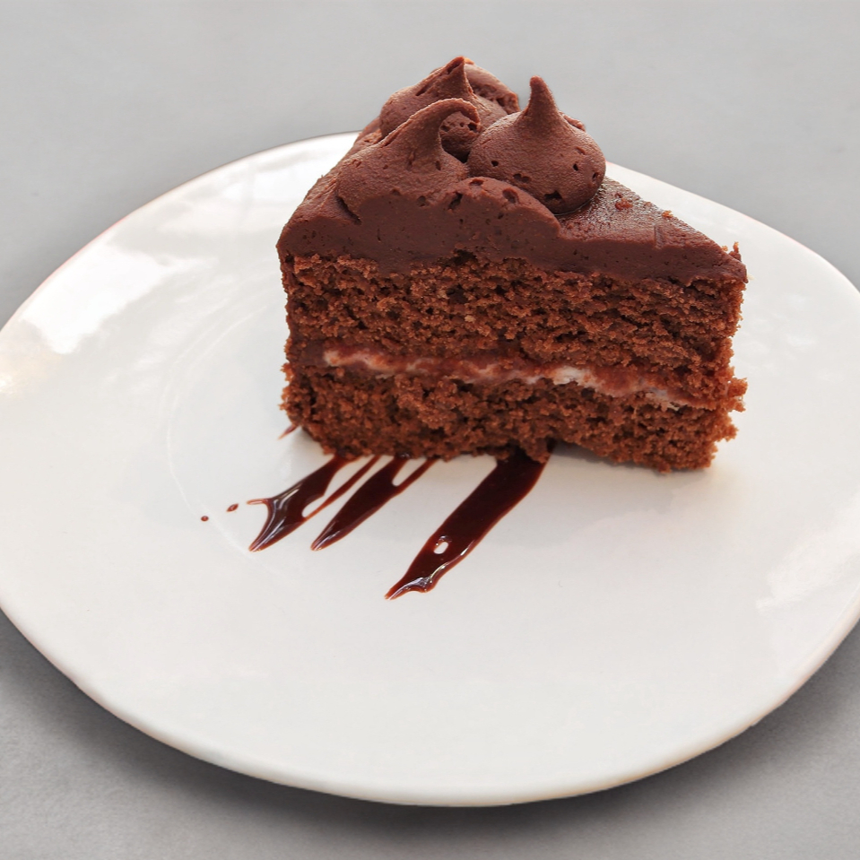 Bizcocho de chocolate, relleno de mermelada casera de frutos rojos y chocolate blanco, embetunado con chocolate semiamargo 9 CM para una sola persona.