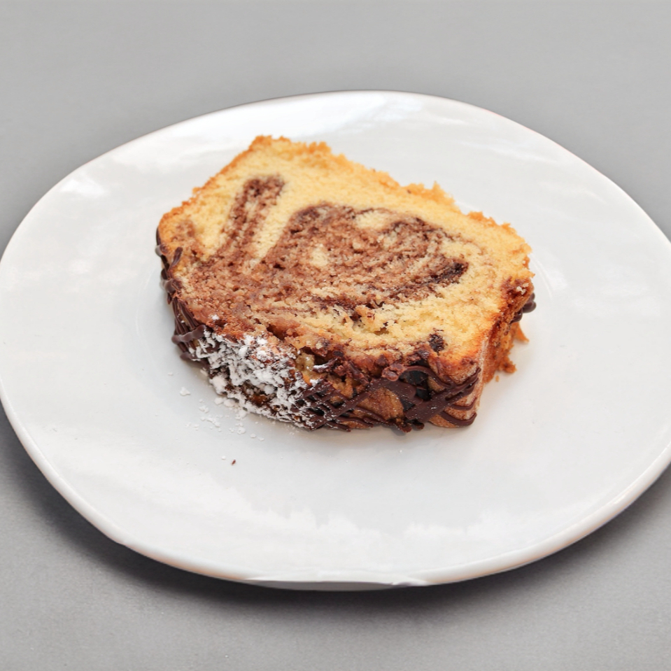 Panque de vainilla con chocolate y una cubierta de rallado de chocolate y azúcar glas.