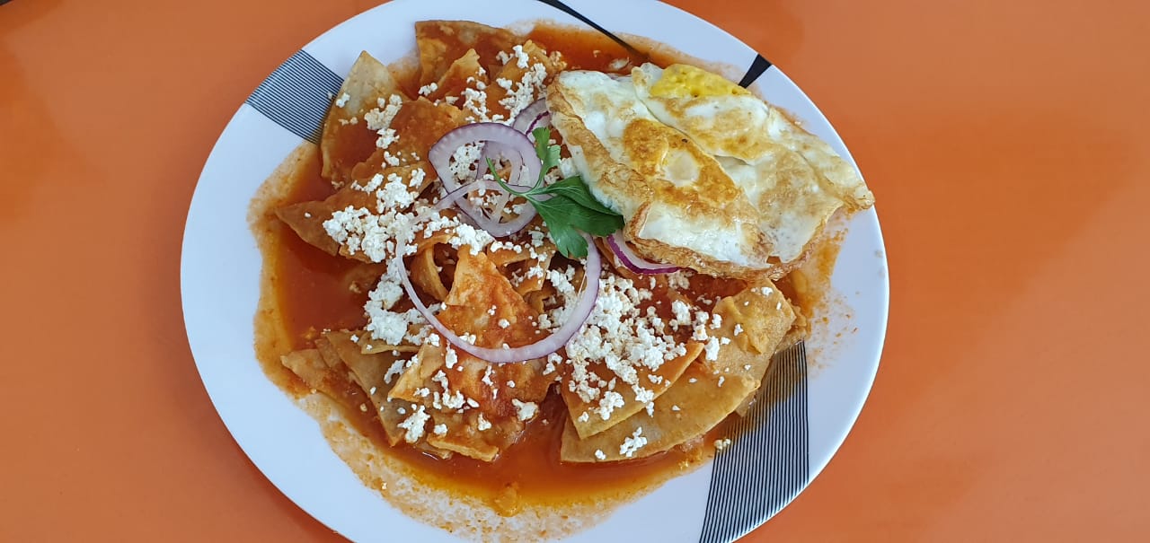 Totopos de maíz bañadas en la salsa de tu preferencia acompañados de 1 proteína, incluye café y gelatina.