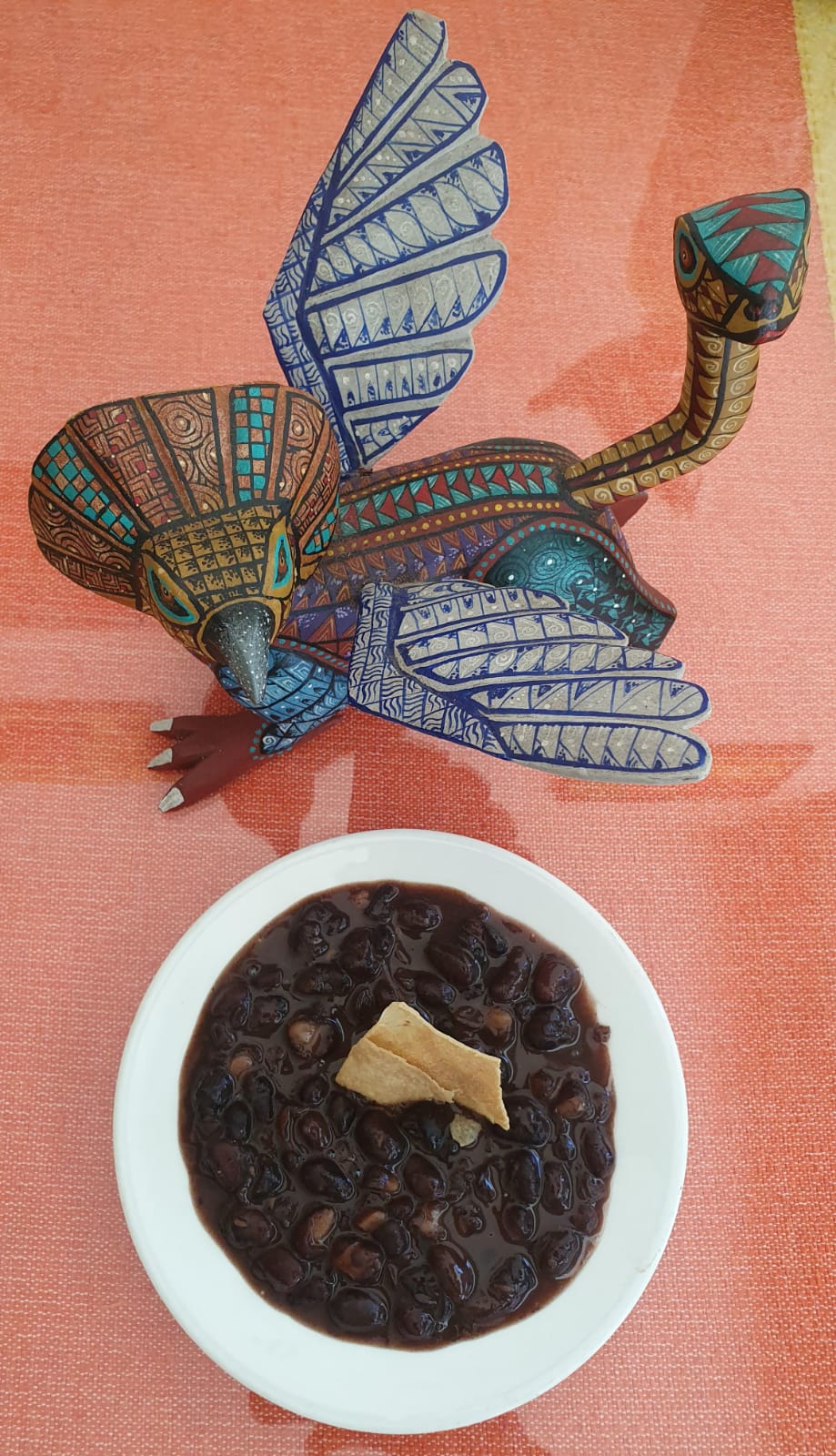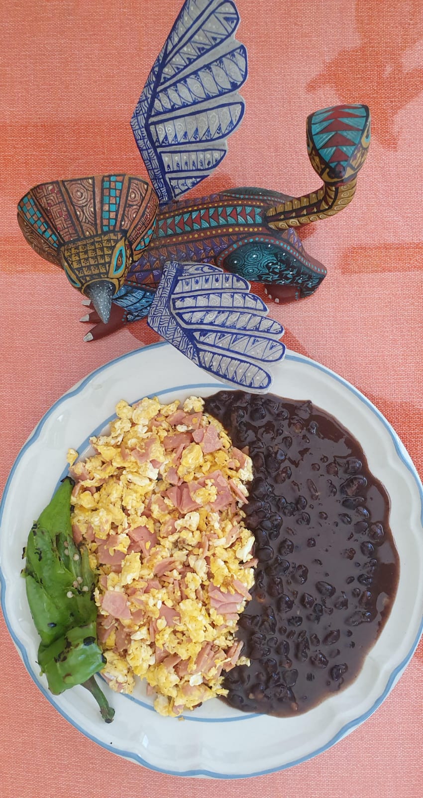 3 Tortillas de maíz bañadas en pasta de frijol acompañadas de 1 proteína, incluye café y gelatina.