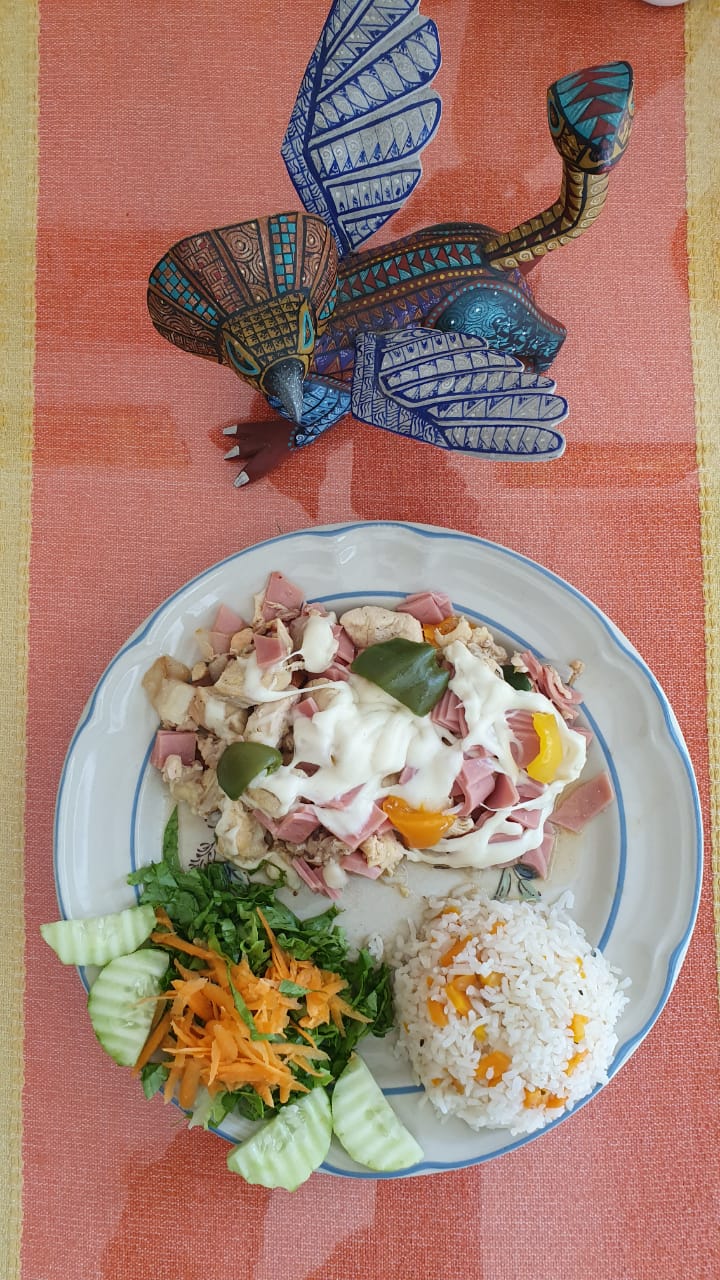 Fajitas de pechuga gratinadas con quesillo acompañadas de chile morrón y jamón, incluye sopa caldosa, 2 guarniciones, 3 tortillas de mano, agua del día y gelatina.