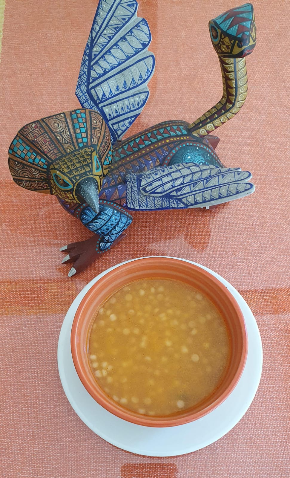 Pieza de pollo en crema de chile poblano acompañada de granos de elote, incluye sopa caldosa, 2 guarniciones, 3 tortillas de mano, agua del día y gelatina.