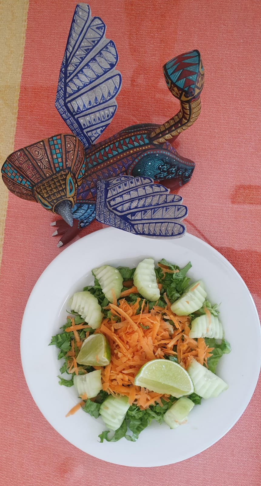 Guarnición de ensalada verde de lechuga, zanahoria, pepino y limón.