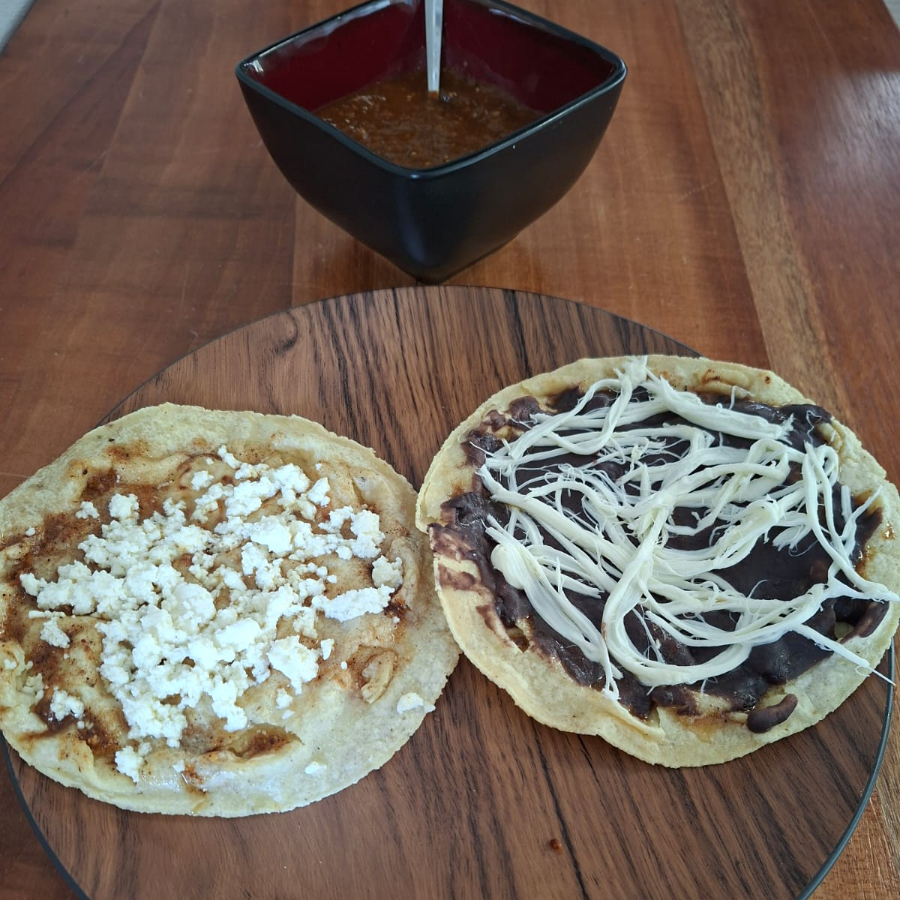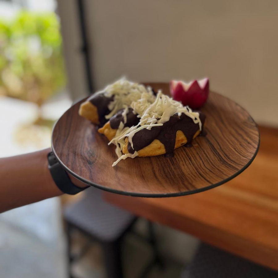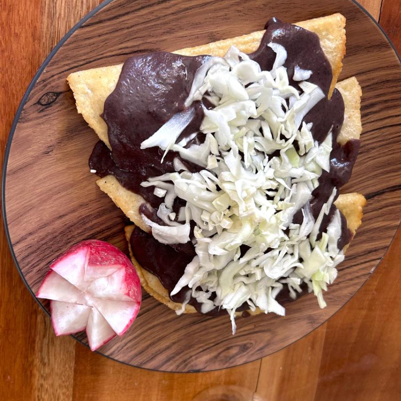 Tortilla frita doblada con quesillo y epazote fresco, cubierta de pasta de frijol y queso fresco.