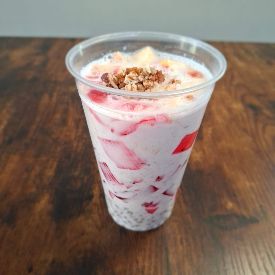 Yogurth de bulgaros, con trigo, trozos de manzana y gelatina.
