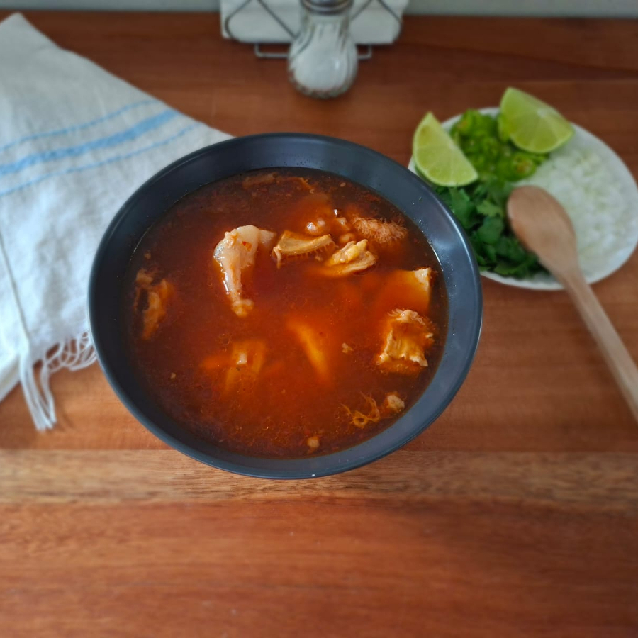 Consome de pacita de Res, con trozos de Pancita, Pata de res, garbanzo y trocitos de papa. Acompañado de 3 tortillas de maíz, cilantro, cebolla picada y rodajas de chile verde