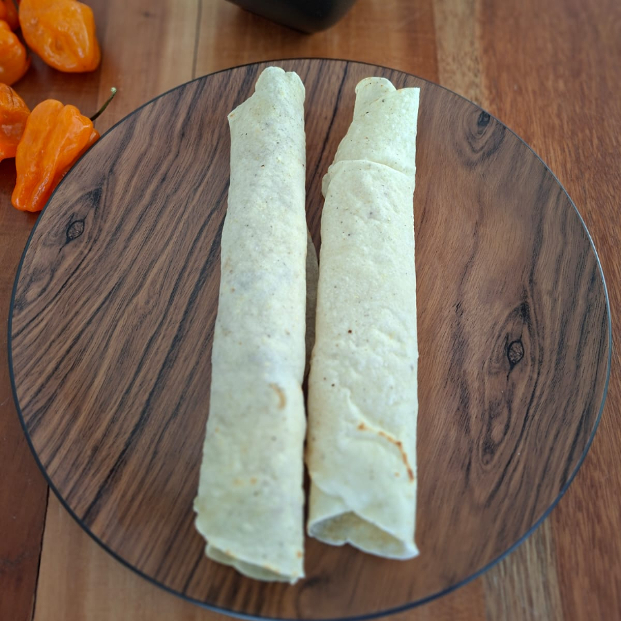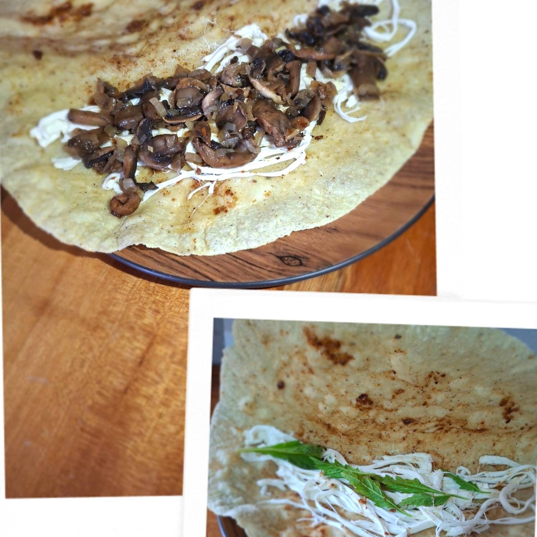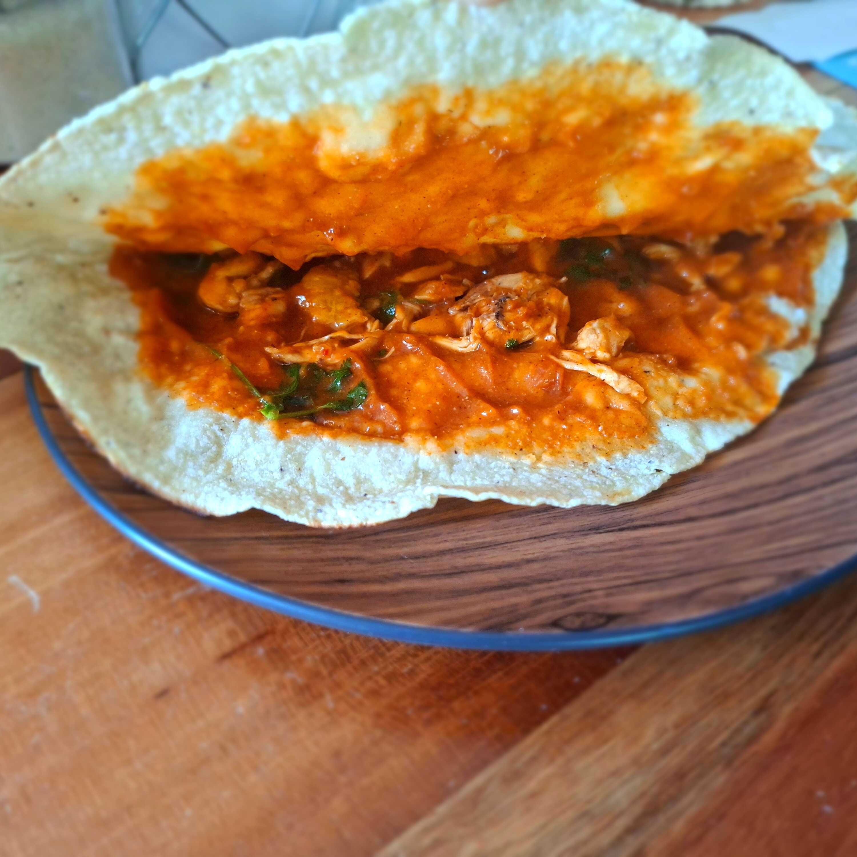 Tortilla grande de maíz, guisado de amarillo, carne de pollo deshebrada y hojas de cilantro.