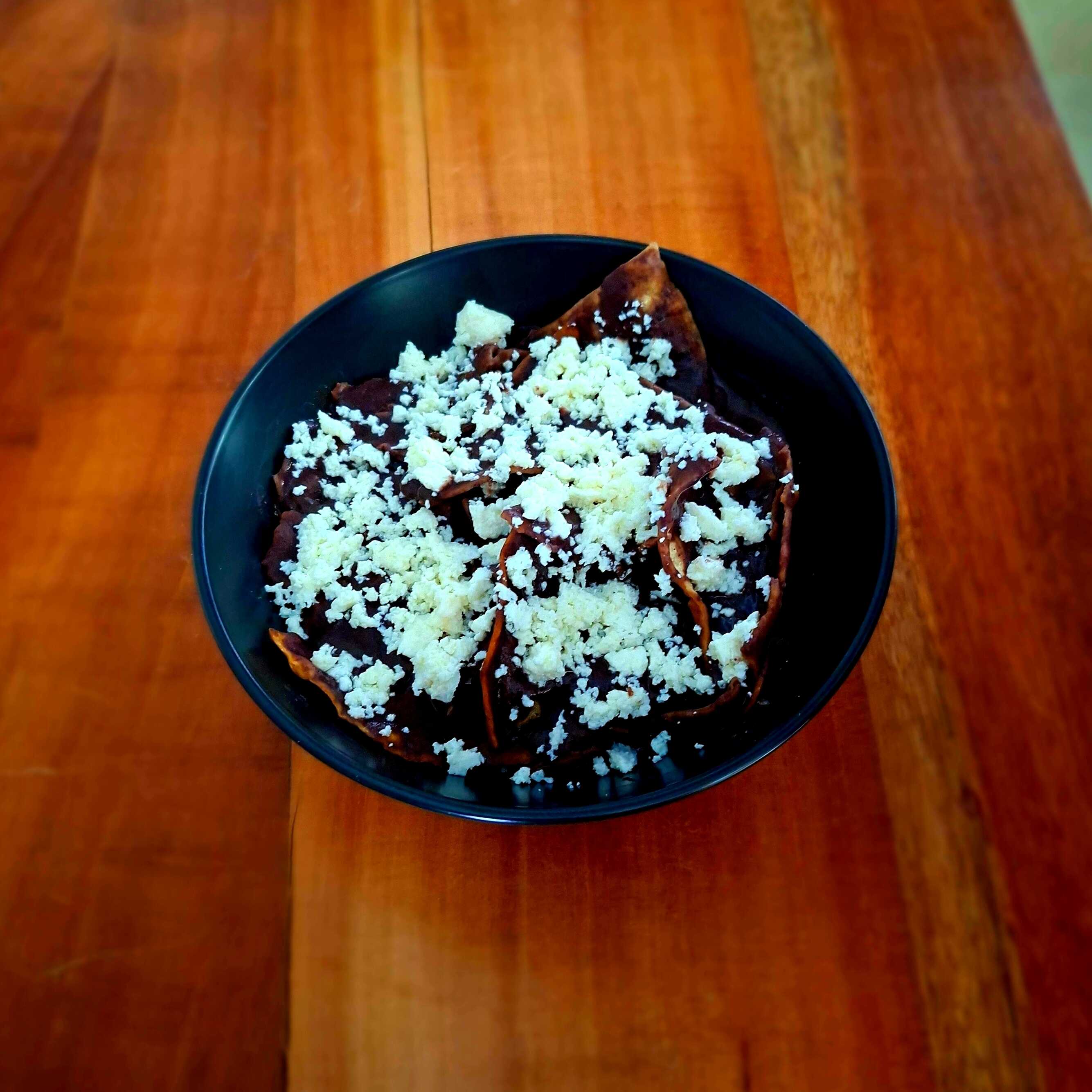 Tortilla frita en totopos, bañados en frijol molido, cubiertos de queso fresco y cebolla fileteada.