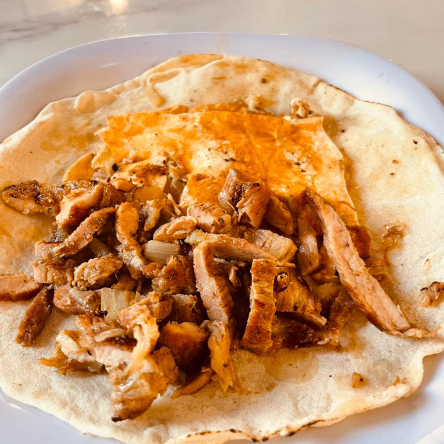 Taco con tortilla de harina, carne y quesillo