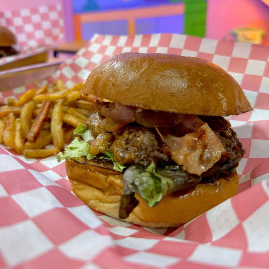 barbacoa de picaña a la cerveza, pepinillos de la casa, montada en brioche con salsa honey spice sauce, lechuga y cebolla.