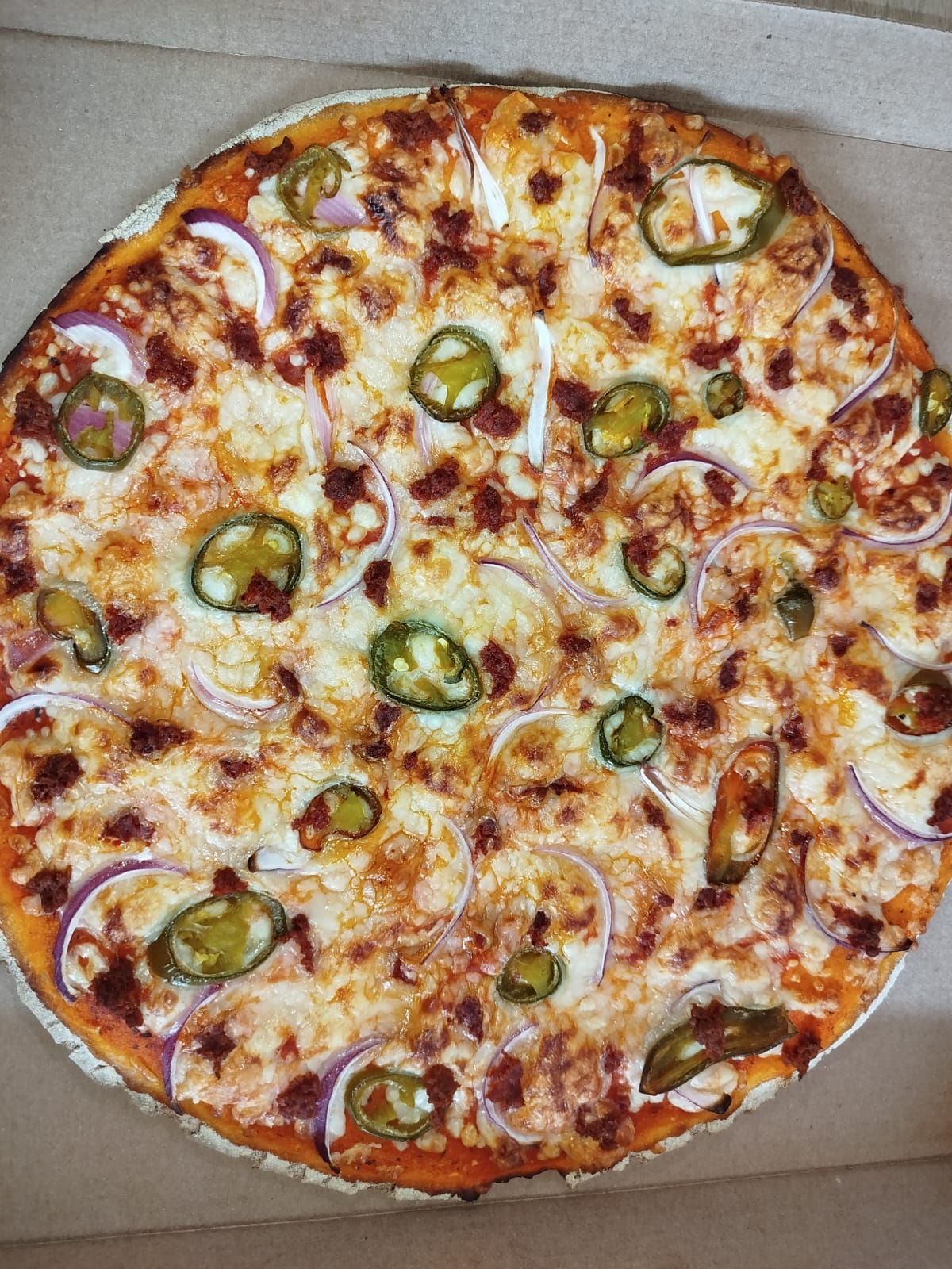 Orilla de pizza rellena con un ingrediente (pepperoni, jamón, tocino, chorizo, tasajo, pastor, piña, cebolla, champiñones, espinaca, tomate, albahaca, aceitunas, quesos).