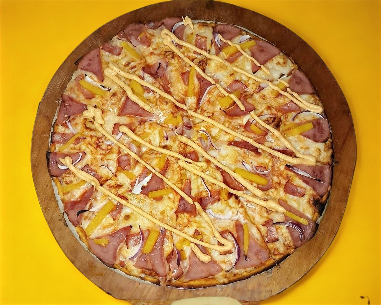 Pizza con un ingrediente a elección (pepperoni, jamón, tocino, chorizo, tasajo, pastor, piña, cebolla, champiñones, espinaca, tomate, albahaca, aceitunas, quesos).