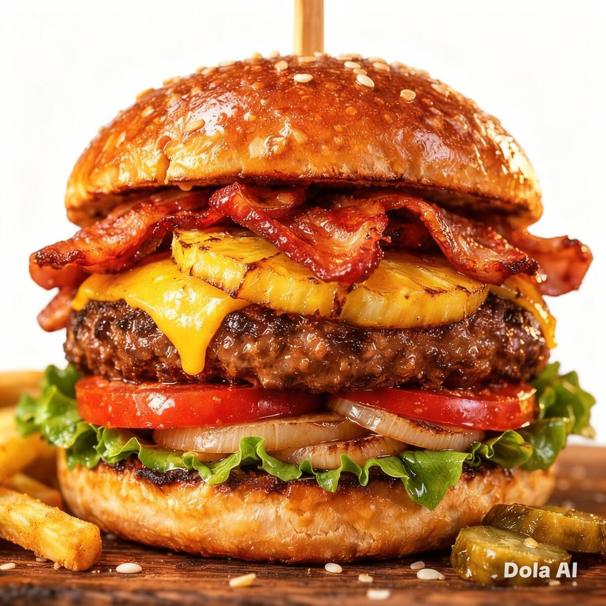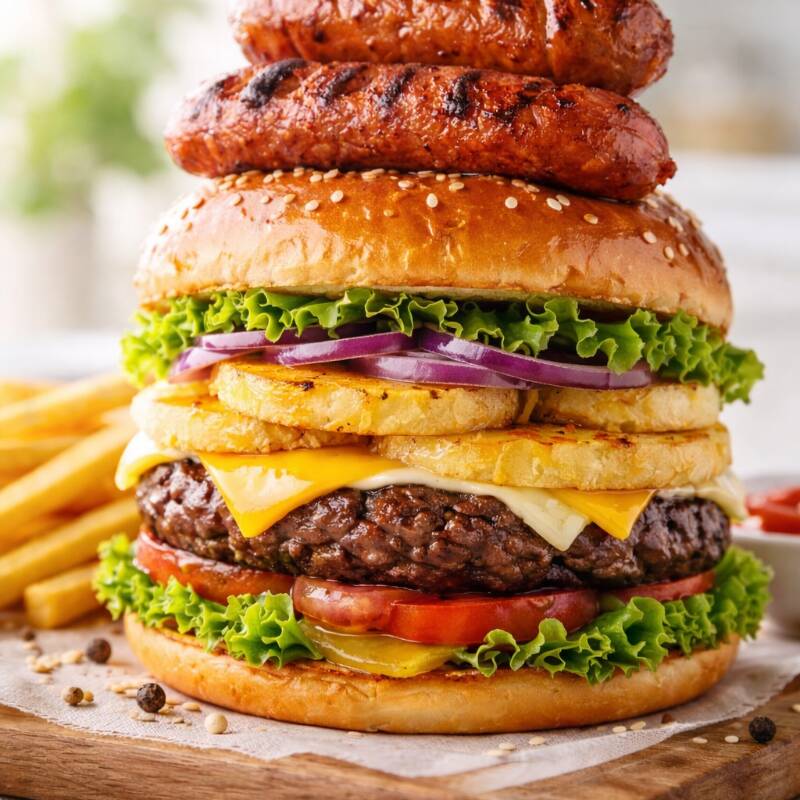 Pan,carne,jamón,queso amarillo,piña, tocino, cebolla caramelizada,lechuga, tomate,aderezos.