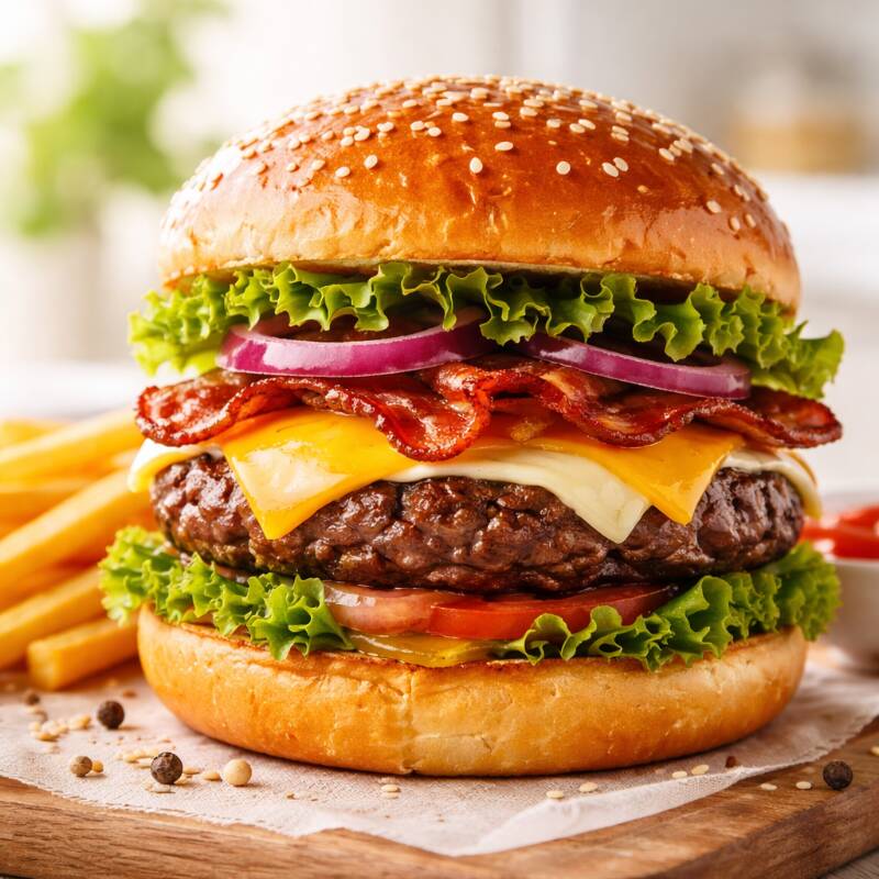Pan,carne,jamón, queso amarillo,quesillo, tocino,queso americano, cebolla caramelizada, lechuga,tomate,aderezos.