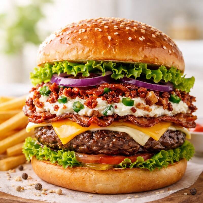 Pan,carne, jamón,queso amarillo,quesillo,tocino, cebolla caramelizada,queso crema Filadelfia con trozos de jalapeño y tocino , lechuga, tomate, aderezos.