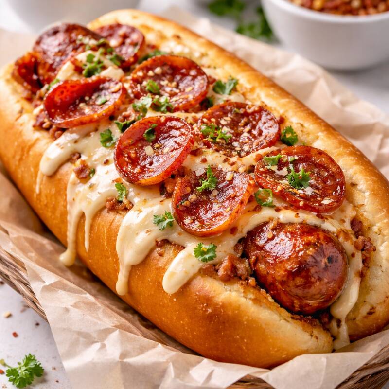 Pan,Salchicha, tocino,quesillo,cebollita caramelizada,tomate,costra de quesos, peperoni, aderezos..