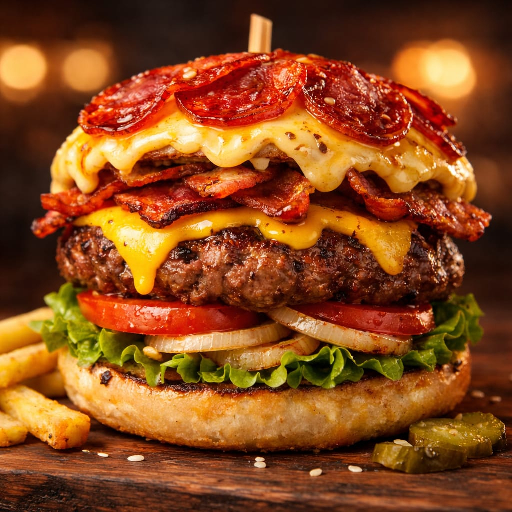 Pan,carne, jamón,queso amarillo,quesillo ,tocino,cebolla caramelizada,costra de quesos, peperoni , lechuga, tomate, aderezos.