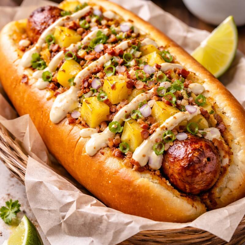Pan,salchicha,tocino,piña, costra de queso,tomate, cebolla caramelizada, aderezos.