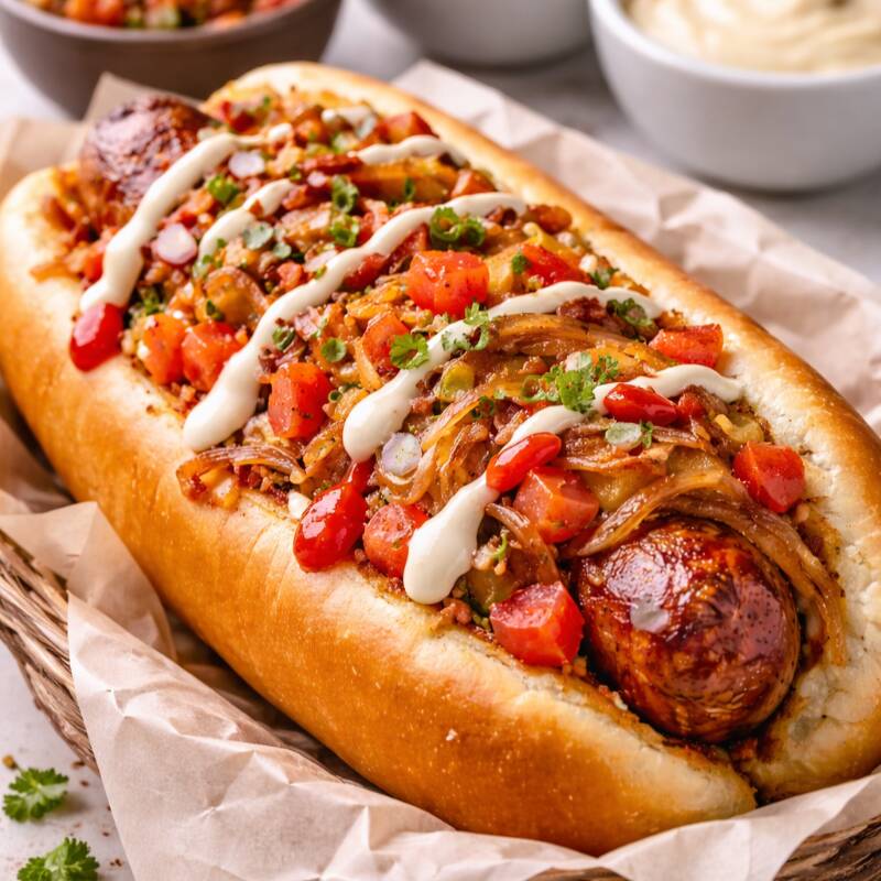 Pan,salchicha, tomate, cebolla caramelizada, aderezos.