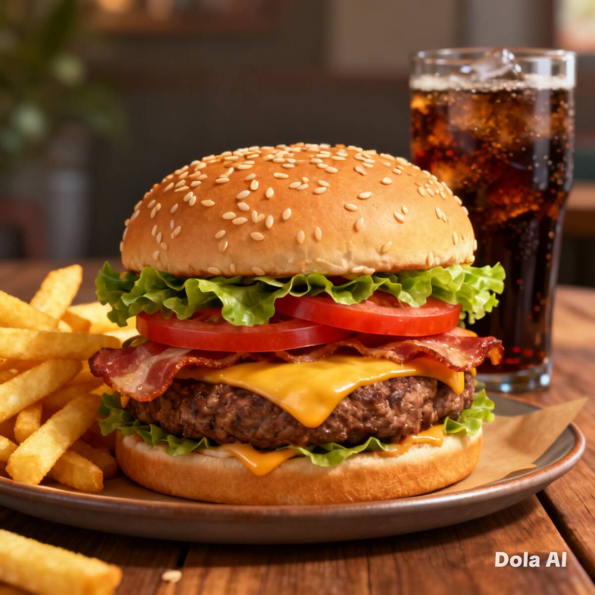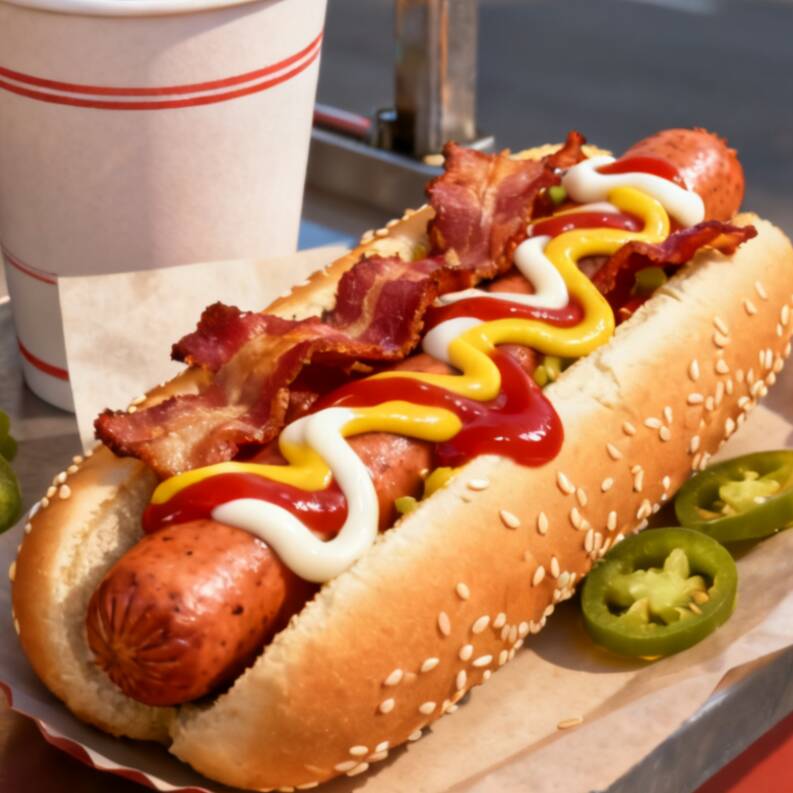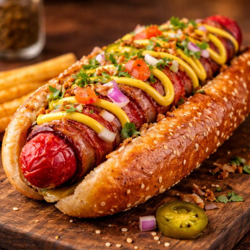 Pan, salchicha para asar,tocino,costra de queso, cebolla caramelizada,tomate, aderezos.