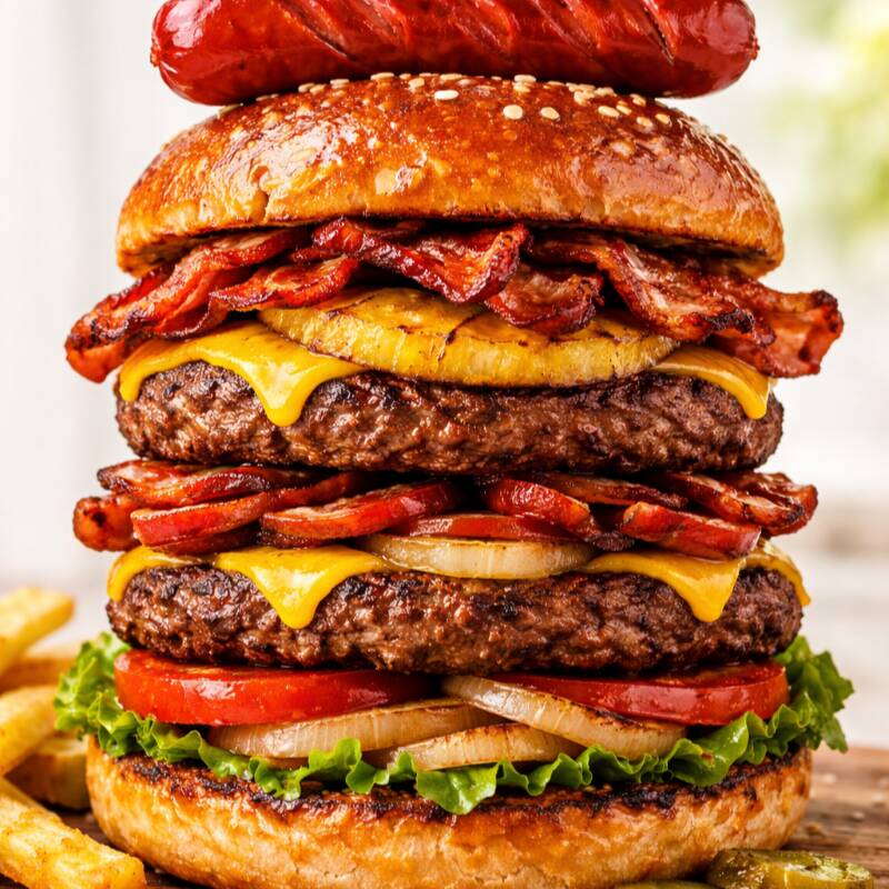 Pan jumbo,salchicha jumbo,tocino, costra de queso,chorizo,piña, cebolla caramelizada,tomate, aderezos.