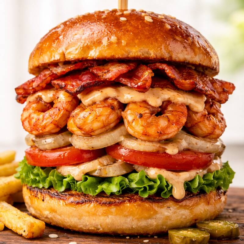 Pan,jamón, queso amarillo,quesillo, camarónes tempura, aderezo de chipotle, cebolla caramelizada, lechuga, tomate, aderezos.