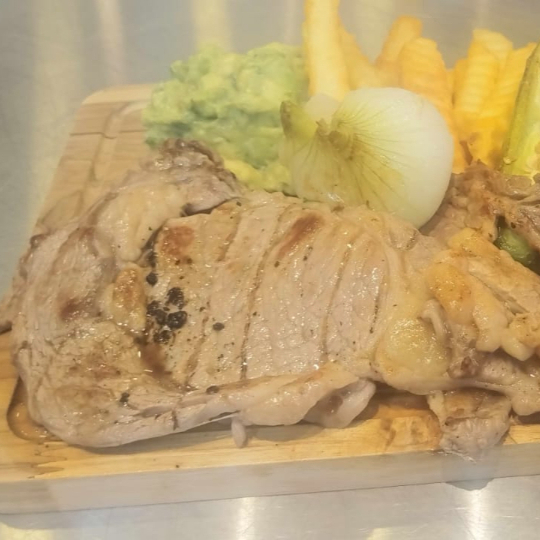 180 gramos de Sirlone (en crudo) marinada. Lo acompaña una ensalada, 50 gramos de papas a la francesa, nopal, cebolla, chile toreado y un delicioso guacamole.