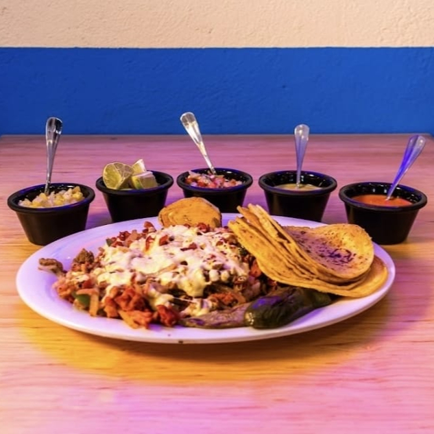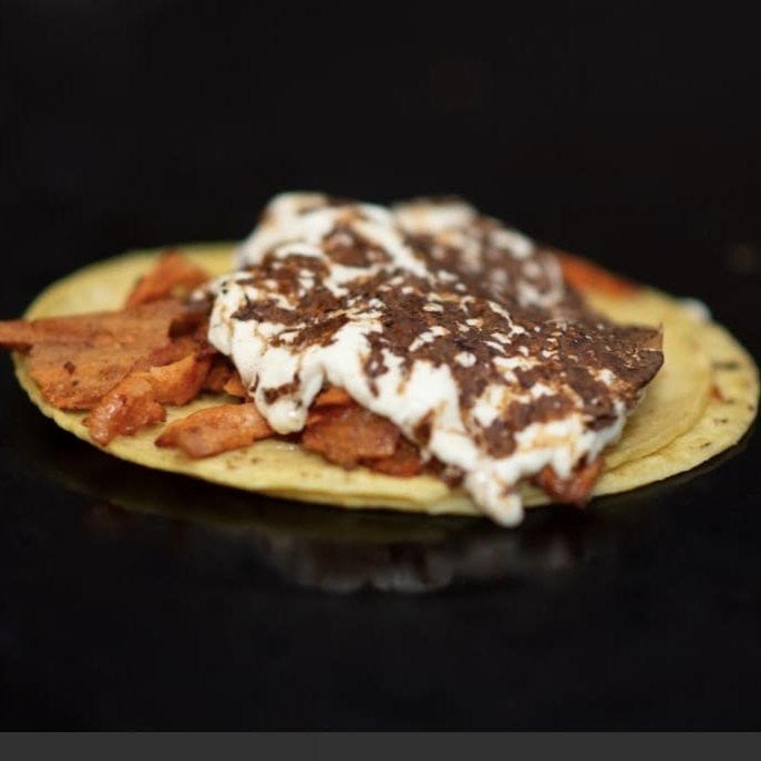Tortilla dorada en brasa, asiento con frijoles refritos, quesillo (queso Oaxaca) repollo, Bistec, Pastor y Chorizo.