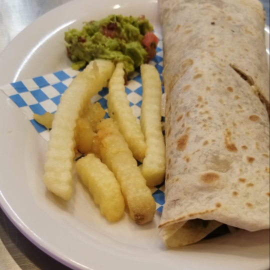 Tortilla de harina de 30 cm de diametro, con frijoles receta de la casa, pimiento morron, cebolla sofrita, queso derretido y bistec. Lo acompañan una porción de papas a la francesa y un delicioso guacamole.
