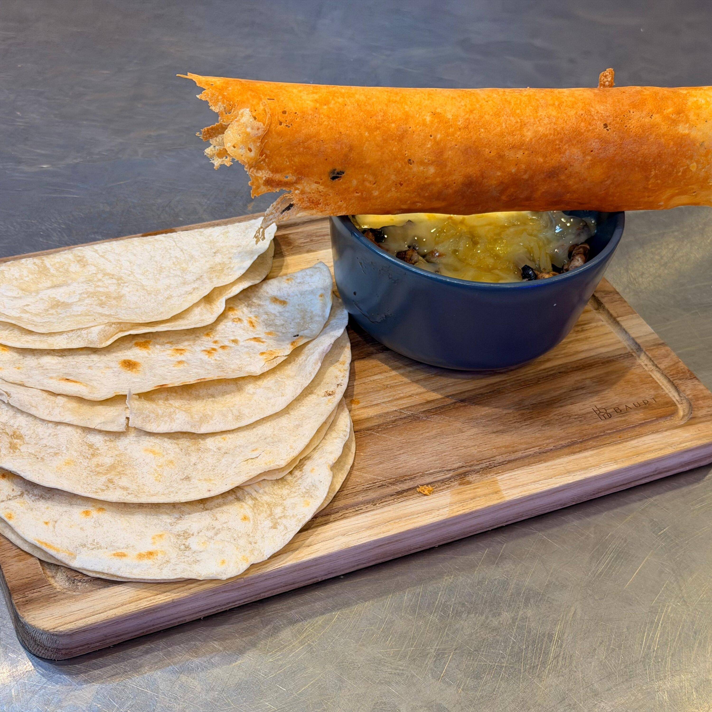 2 tortillas de harina rellenas de quesillo (queso Oaxaca) y champiñones salteados en la plancha.