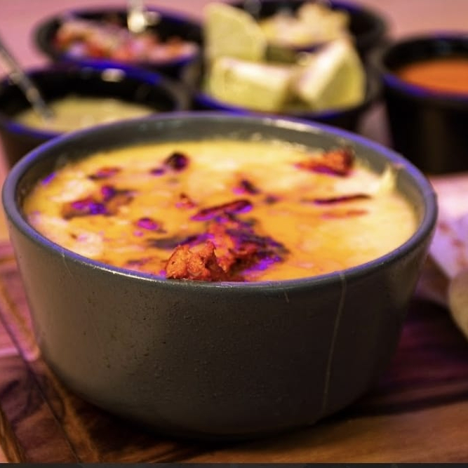 Puré de papa con carne Arrachera, queso amarillo, media crema y gratinada con queso. Se acompaña con una porción de tortillas refritas.