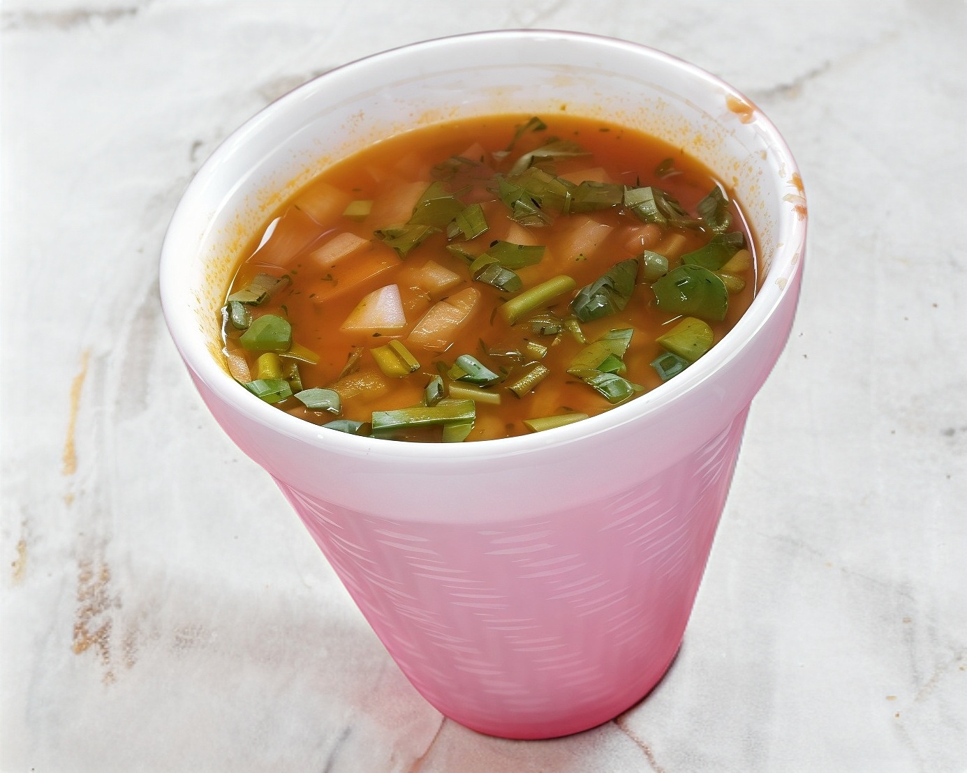 Consomé 1/2 lt sin carne, acompañado de cebolla, cilantro y salsa.