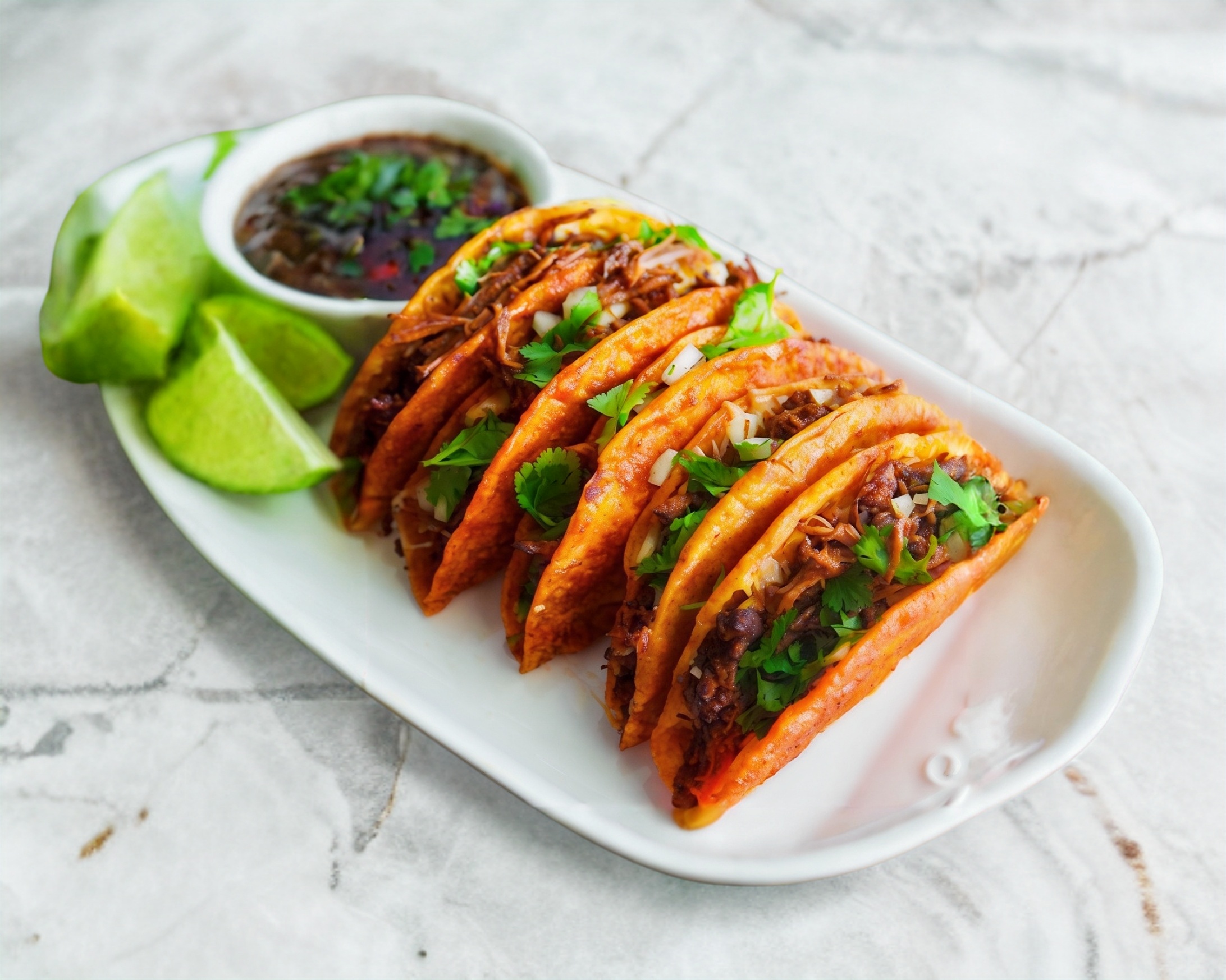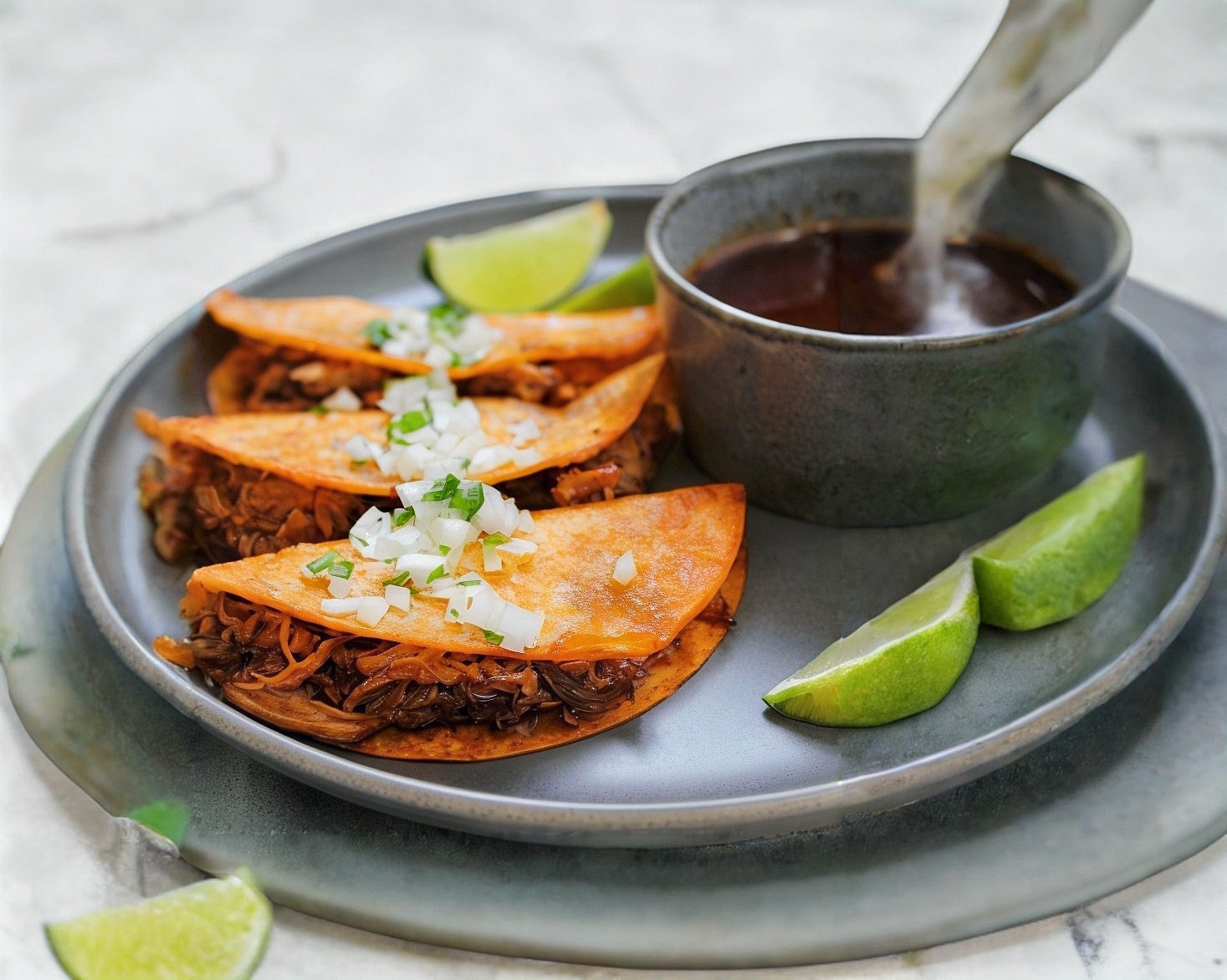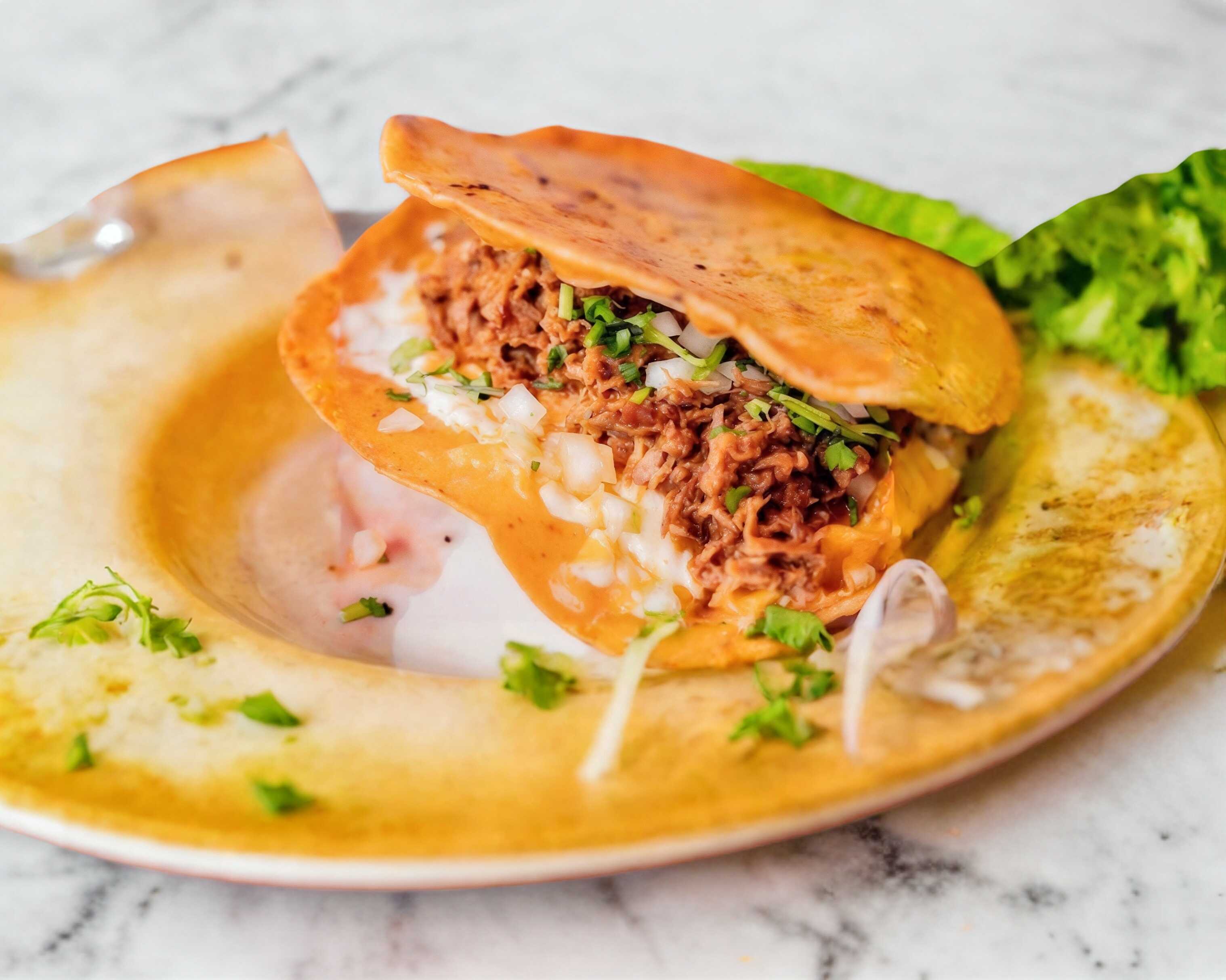Dos tortillas doradas con birria, queso fundido en medio y frijoles negros refritos, incluye, cebolla, cilantro, limon y salsas