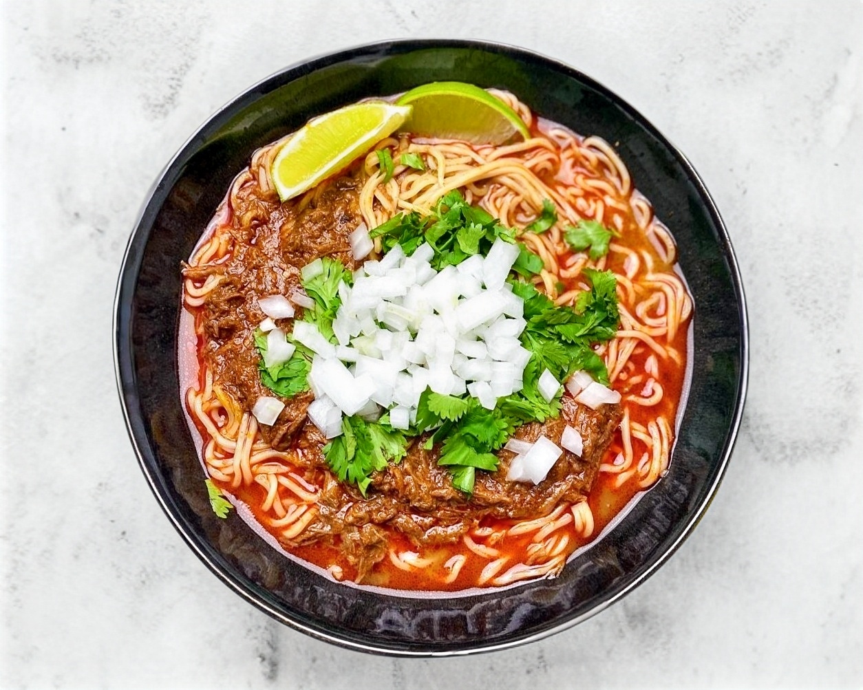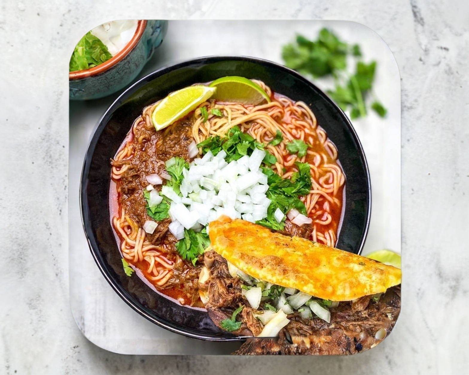 Consomé de 1lt con sopa de fideos ramen y con 120gr carne de birria, acompañado de cebolla, cilantro y salsa.