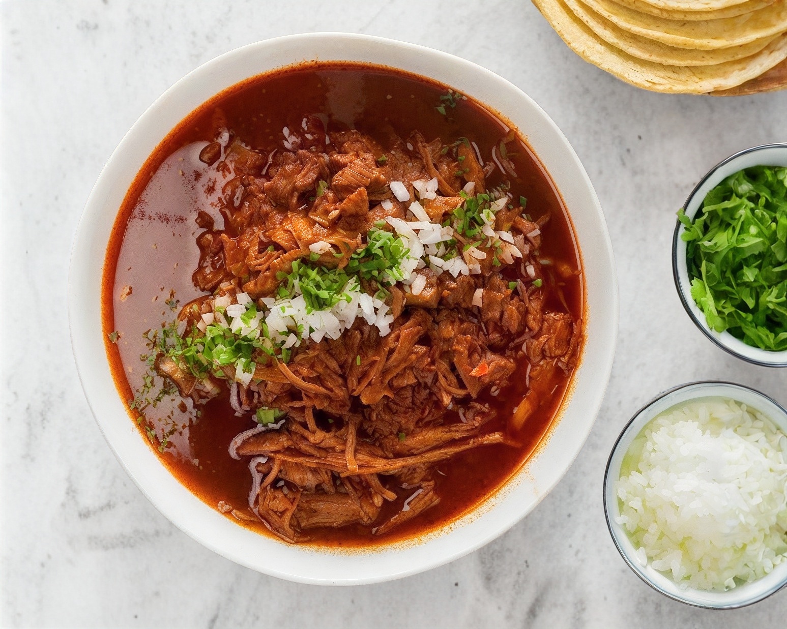 Consomé de birria de res con 120gr de carne, incluye cebolla, cilantro, limon, salsa y tortillas.