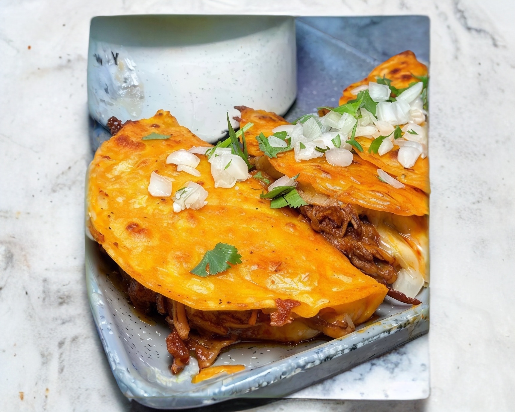 Quesabirria con tortilla de harina de 25cm incluye cebolla, cilantro, limón y salsas.