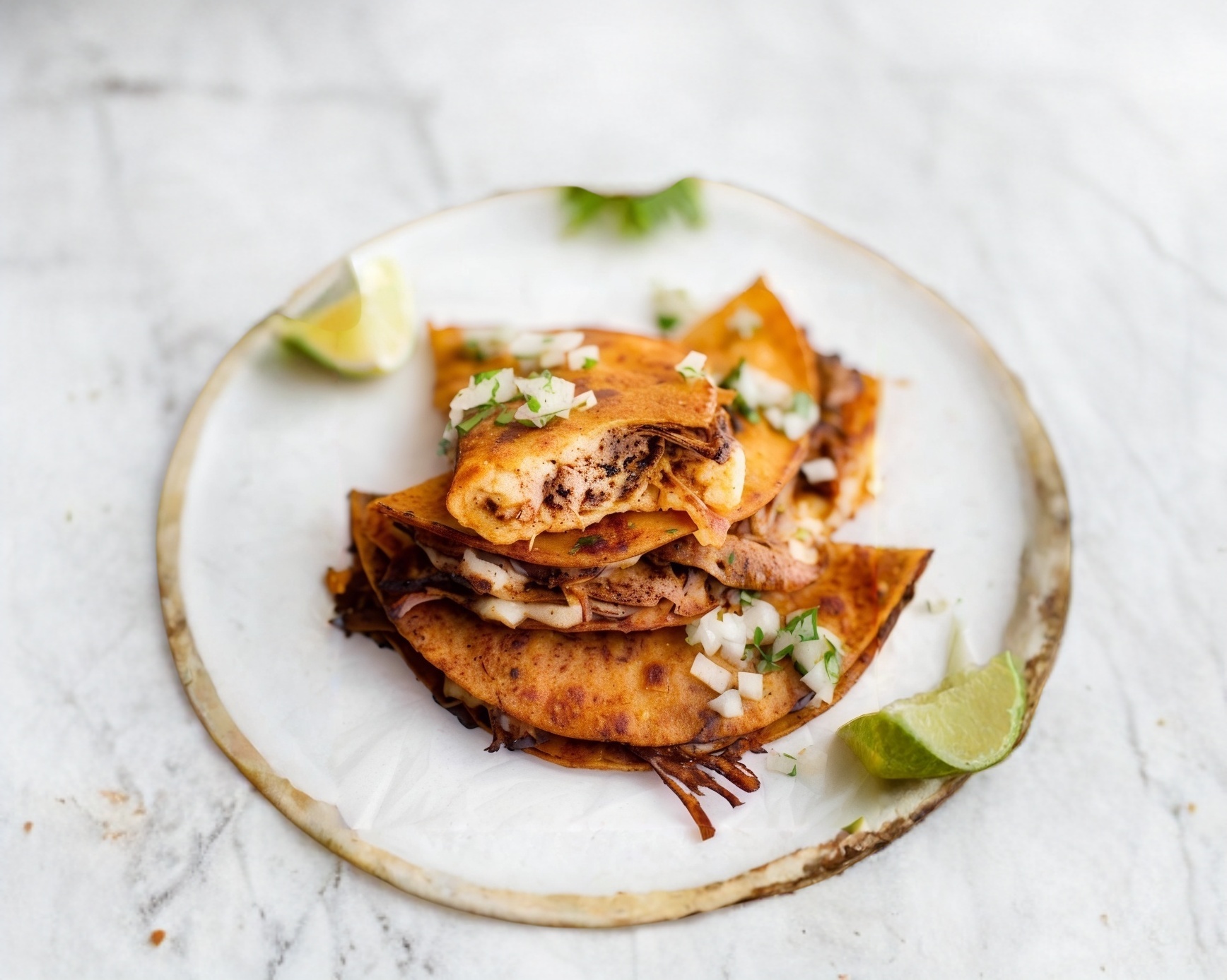 2 quesabirrias de harina + 2 quesabirrias de maíz, incluye cebolla, limón, cilantro y salsa