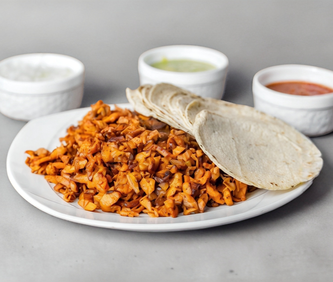medio litro de cochinita pibil acompañada de cebolla morada y tortillas de mano