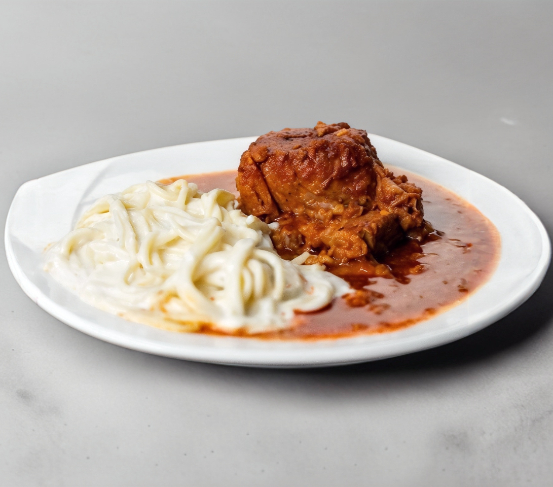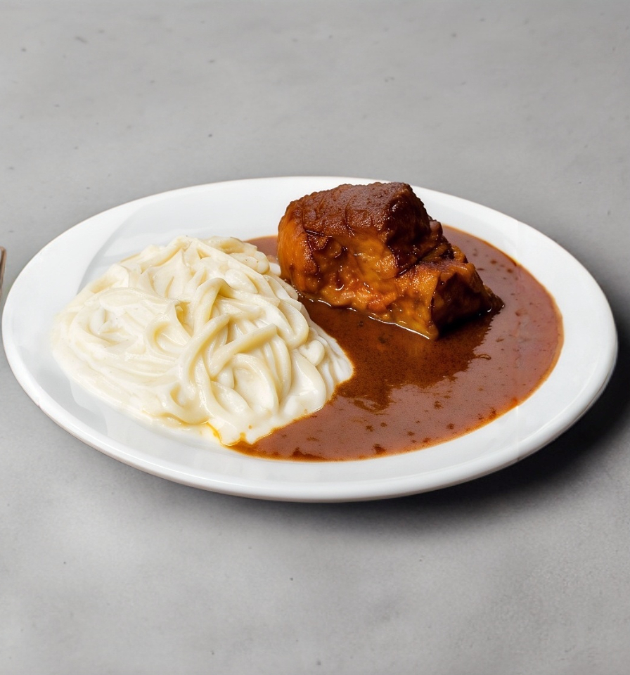 Pierna de cerdo mechada estilo casero, sazonada con especias y cocida lentamente hasta quedar tierna y llena de sabor.