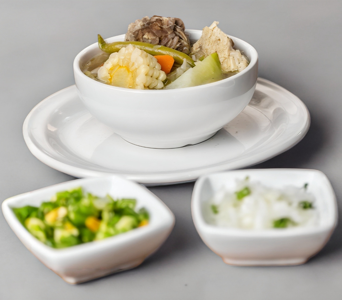 Caldo de res con verduras, acompañado de cilantro picado, cebolla picada y chile jalapeño picado